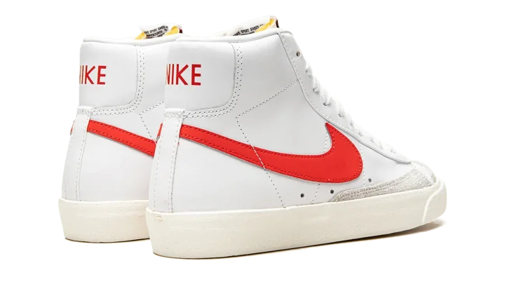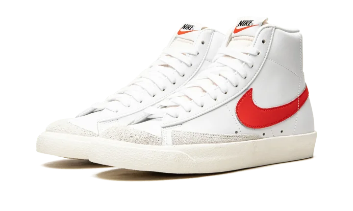 The Women's Nike Blazer Mid '77 Vintage "Habanero Red" is the women's sizing of the vintage basketball shoe in a classic two-tone color block. One of multiple Blazer colorways to feature a white leather upper paired with a contrasting leather Swoosh, the "Habanero Red" cuts a strong look for the summer and warm weather months, and beyond. As mentioned, the upper is constructed from white leather. Grey suede overlays appear on the toe and forefoot. A Habanero Red leather Swoosh graces either side. On the back, old school "Nike" branding on the heel in the same fiery red hue gives the shoe a retro appearance. Classic Nike and Swoosh branding on the tongue tag of the nylon tongue adds to the shoe's vintage vibe. A cream rubber sole completes the look.