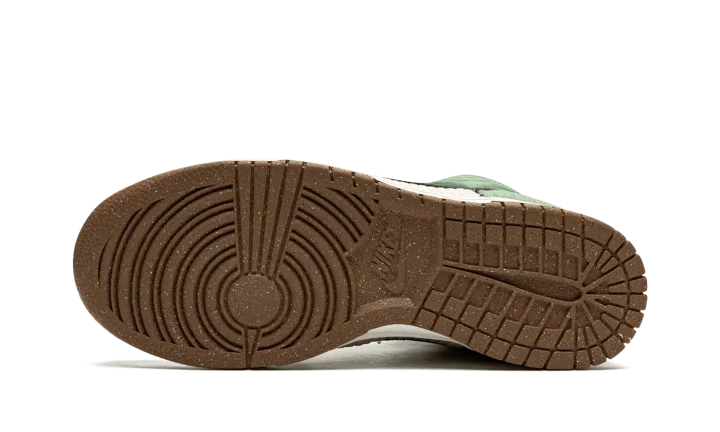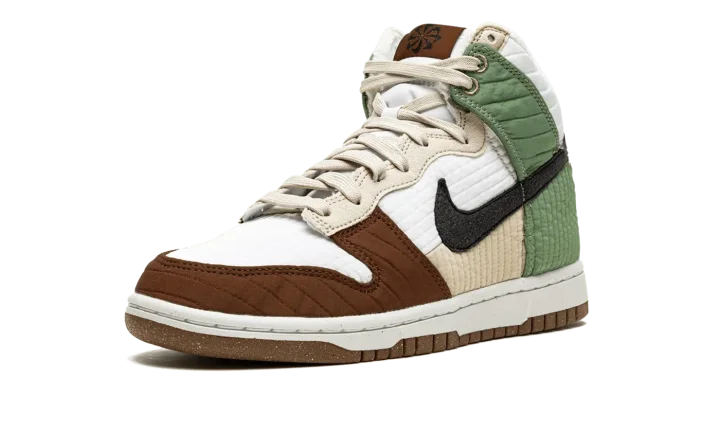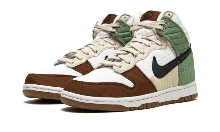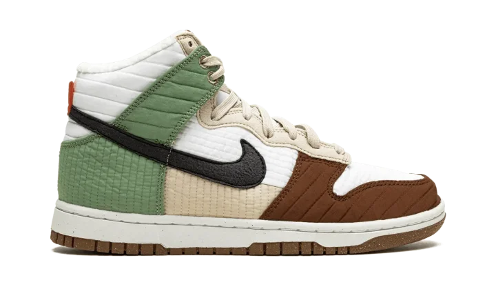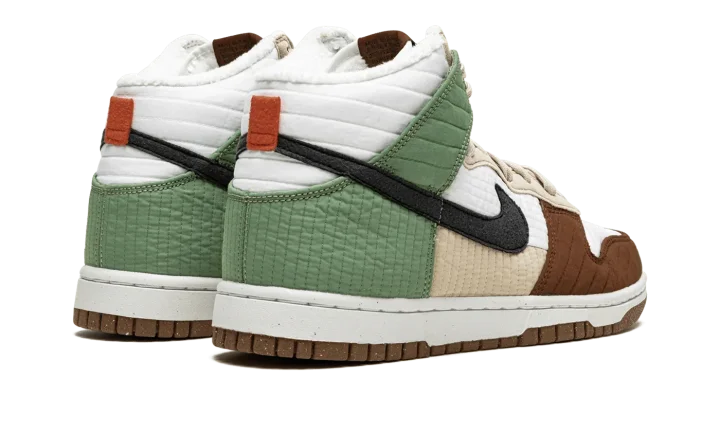 The Women's Nike Dunk High LX "Toasty" is a winter-ready colorway of the women's version of the retro basketball shoe that features a modified, eco-friendly construction. Designed to be worn in cold weather, the "Toasty," as its name implies, is complete with several design updates made specifically for winter. Constructed from 20% recycled content by weight, the shoe displays a quilted textile upper that mimics the look of winter outerwear. Mismatched panels in brown, green, and tan contrast the look of the white and tan base. A black synthetic leather Swoosh appears on both sides of the shoe. The pinwheel graphic printed on the brown tongue tag references the shoe's sustainable design. A fun-loving "Toasty" graphic appears on the insole as a nod to the warm fleece inner lining. Release date: November 3, 2021