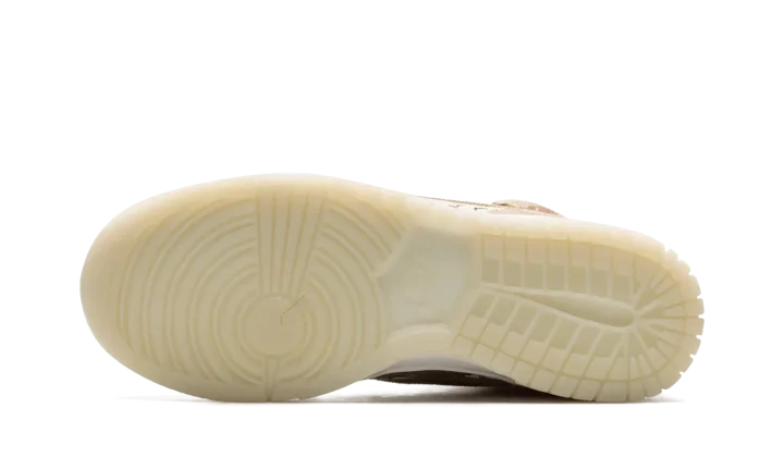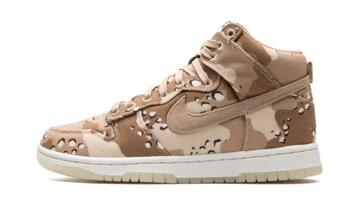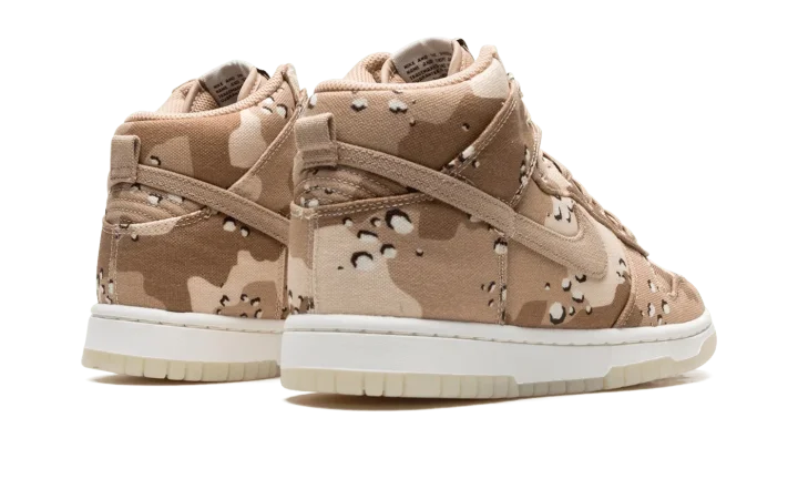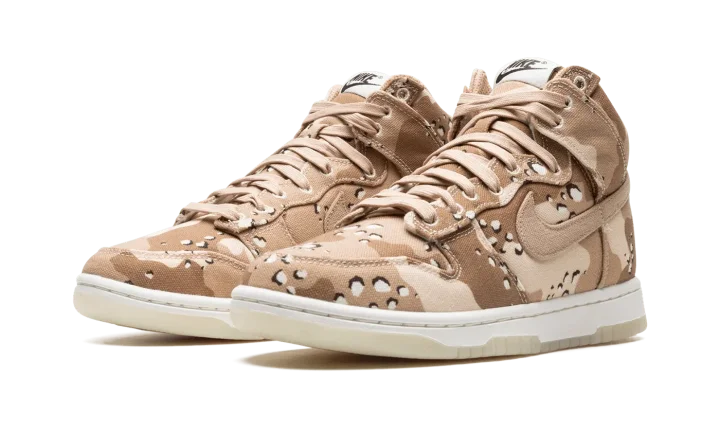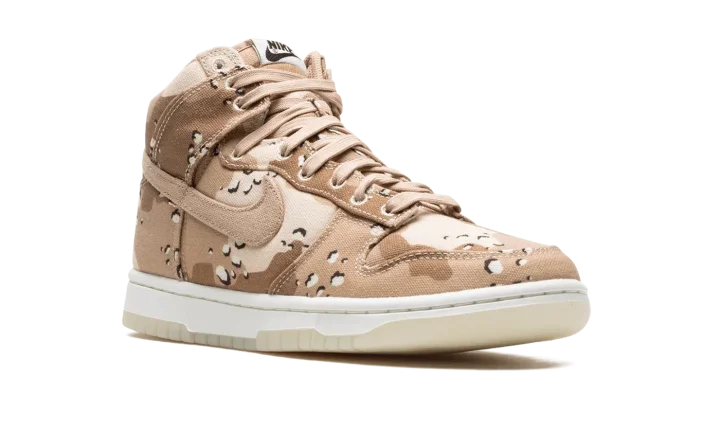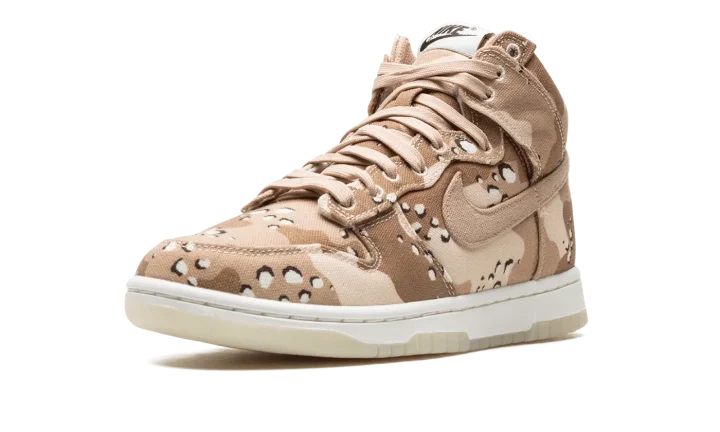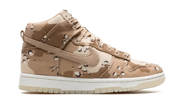 The Women's Nike Dunk High "Desert Camo" is a women's-exclusive colorway of the retro basketball shoe that features an appealing desert camo design. The "Desert Camo" is equipped with an all-over desert camo canvas upper. The look is contrasted with a tan canvas Swoosh on the sides and tan laces. Classic black "Nike" and Swoosh branding can be found on the white nylon tongue tag. The white midsole is contrasted with a semi-translucent outsole. Release date: August 26, 2022