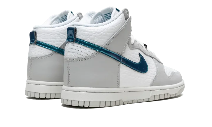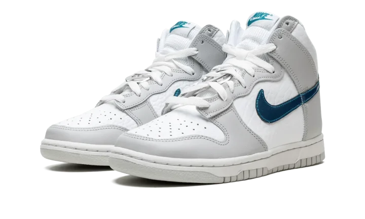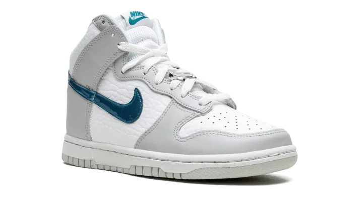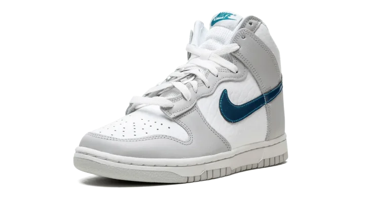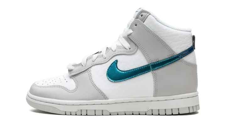 The Women's Nike Dunk High "FLS" is a women's-only version of the retro basketball and lifestyle shoe in a colorway that's muted yet bold at the same time. The Dunk High "FLS" features a white tumbled leather base with contrasting grey leather overlay panels on the toe cap, forefoot, eyelets, collar, and heel. The shoe's Teal Metallic leather Swoosh garners attention on either side of the shoe. The same hue of teal is found on the "Nike" and Swoosh branding located on the tongue tag on the white mesh tongue. Release date: April 6, 2022