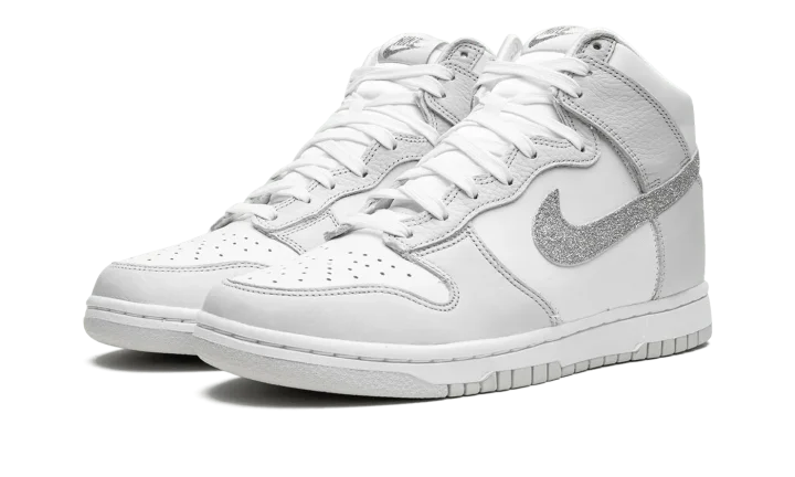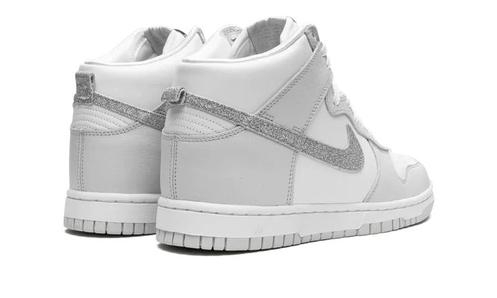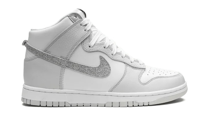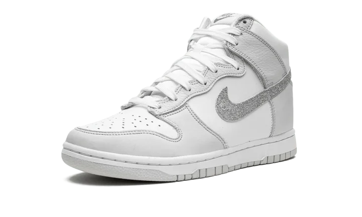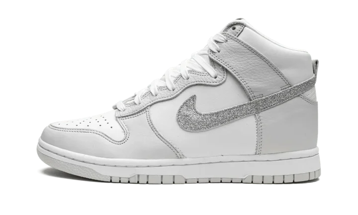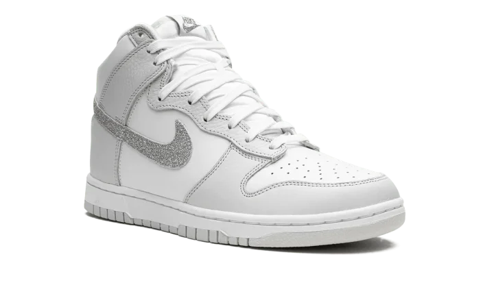The Women's Nike Dunk High "Silver Swoosh" is a women's-exclusive colorway of the vintage basketball sneaker with a bold Swoosh logo. Great for casual, everyday wear, the Dunk High's "Silver Swoosh" colorway features a low contrast color scheme with white leather on the base and light grey on the overlays. A glittery metallic silver Swoosh logo can be found on the sides of the sneaker. Classic "Nike" detailing appears on the tongue. Underfoot, the shoe is complete with a white rubber midsole and grey outsole.