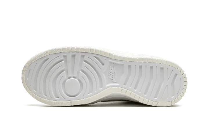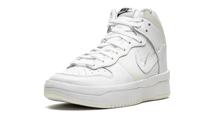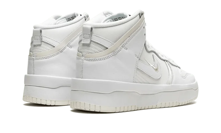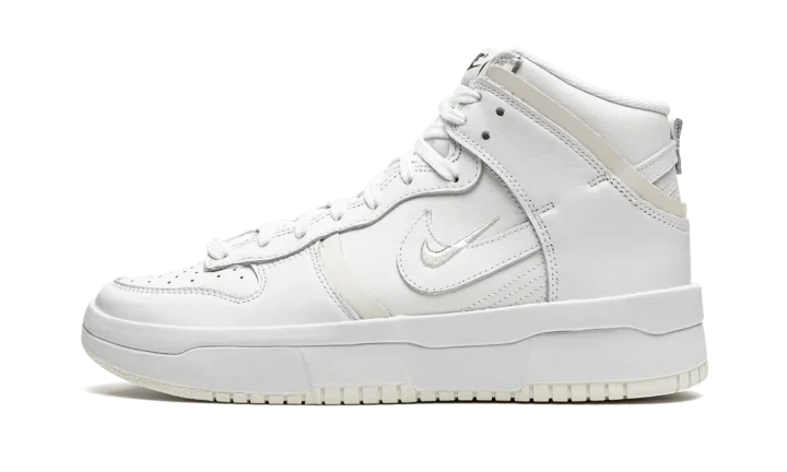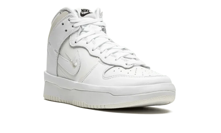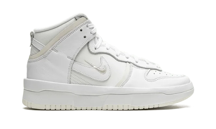 The Women's Nike Dunk High Rebel "Summit White / Sail" is an alternate version of the retro basketball shoe for women with a future-forward appearance. The "Summit White / Sail" was released by Nike in August 2021 and is a variation of the vintage basketball shoe that features raised leather panels and multiple Swoosh logos on its design. Details include a white leather base with contrasting Sail-colored, overlapping leather panels on the forefoot and heel. A miniature white Swoosh is embroidered over a leather Swoosh on the sides. The white nylon tongue tag is complete with black "Nike" and Swoosh detailing. A double-stacked white foam midsole gives the shoe a platform-style appearance. Underfoot, Nike designs the outsole in Sail-colored rubber. Release date: August 12, 2021
