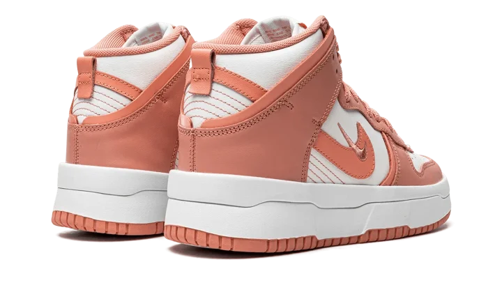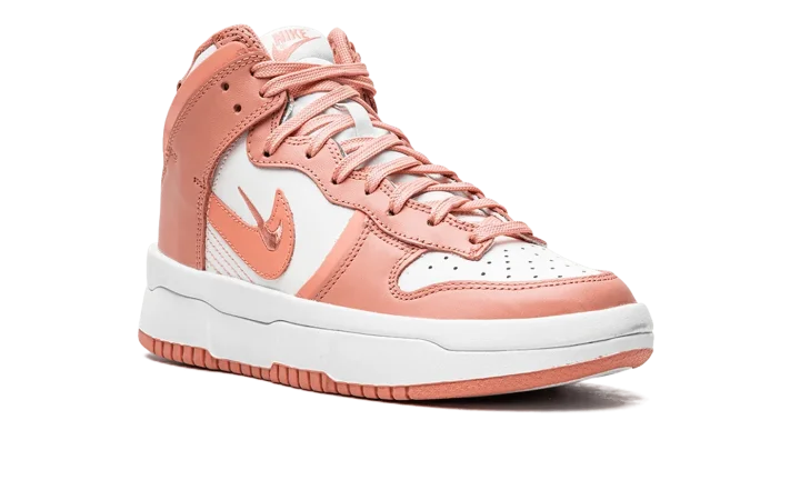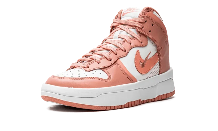 The Women's Nike Dunk High Up "Sail/Light Madder Root" is an alternate version of the classic sneaker in women's sizing with an exaggerated, platform-style sole and other design modifications. The Dunk High Up "Sail/Light Madder Root" is a casual-looking colorway that features a white and dusty pink color block. The shoe's base is designed in white tumbled leather. The forefoot, raised eyelet panel and collar overlay appear in contrasting pink leather. A small Swoosh is embroidered over a standard leather Swoosh on the lateral side of the shoe. Classic "Nike" and Swoosh detailing is found on the tongue tag on the nylon tongue. Underfoot, a raised white foam midsole sits above a cored-out, white rubber outsole. Release date: May 1, 2022
