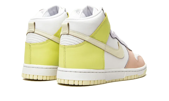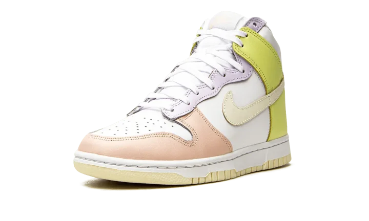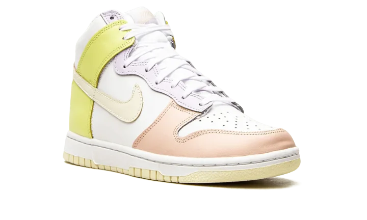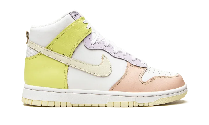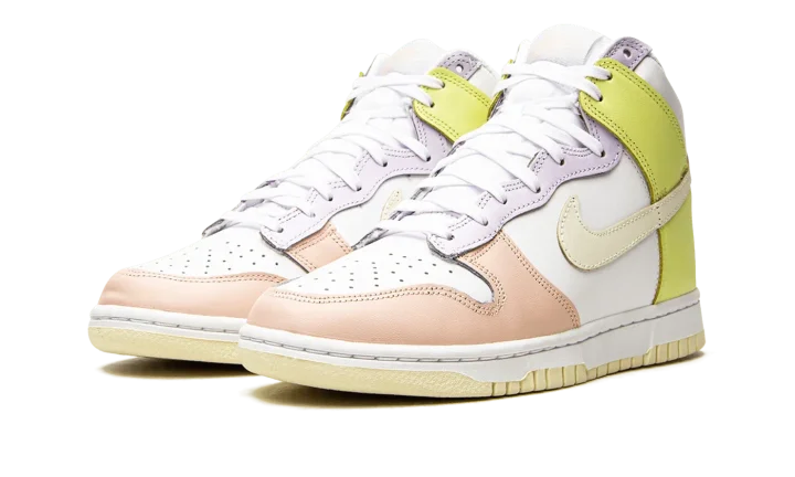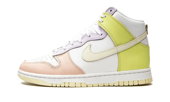 The Women's Nike Dunk High "Lemon Twist" is a women's version of the classic basketball shoe in a summer-inspired colorway. With its various pastel colors, the "Lemon Twist" is primed for casual wear during the warmer months of the year, but no less appealing no matter the season. The upper's white leather base is contrasted by pastel-colored leather panels, including light pink on the toe cap, violet purple on the eyelets, and neon green on the collar and heel. A light green leather Swoosh appears on either side of the shoe. A classic "Nike" logo with a Swoosh can be found on the tongue tag. Release date: July 1, 2021