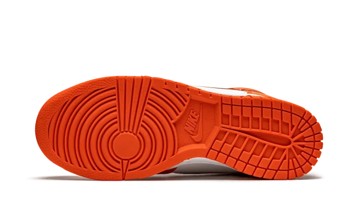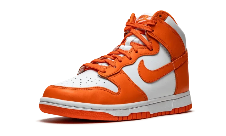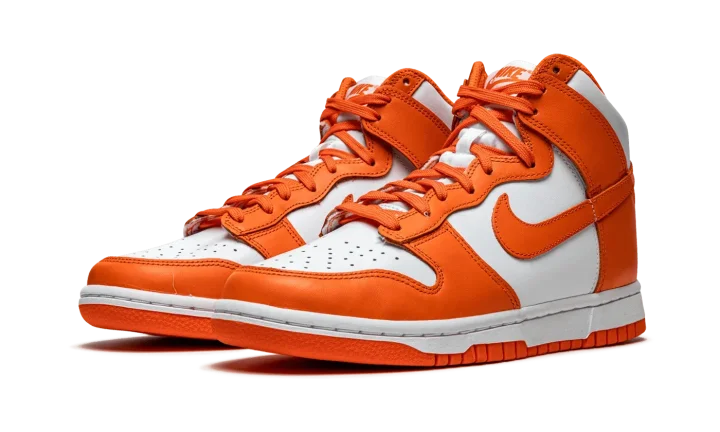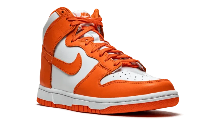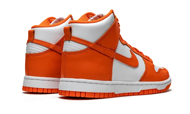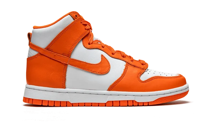 The Women's Nike Dunk High "Syracuse" is the women's sizing of an original Dunk colorway from 1985's "Be True to Your School" collection. Released by Nike in March 2021, the "Syracuse" Dunk High succeeds the low-top version of the shoe that was re-released in March 2020. The original "Syracuse" was part of the aforementioned collection of collegiate inspired Dunks that represented various college basketball programs in the mid-80s. As for the design, Orange Blaze overlays on the forefoot, eyelets, collar, and heel pop against the upper's white leather base. The same bright hue of orange leather can be found on the Swoosh branding on either side, on the heel tab, and on the laces layered over the white mesh tongue. Classic Nike detailing is printed in orange on the nylon tongue tag. Underfoot, a white rubber midsole and orange outsole put the finishing touches on this true-to-original remake of the timeless Nike Dunk High "Syracuse." Release date: March 10, 2021.