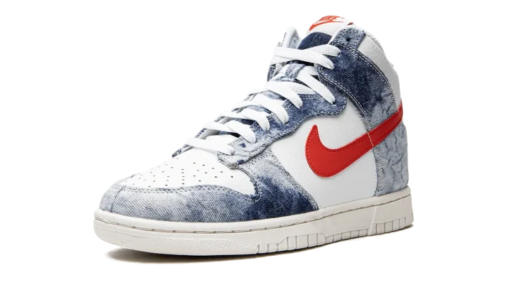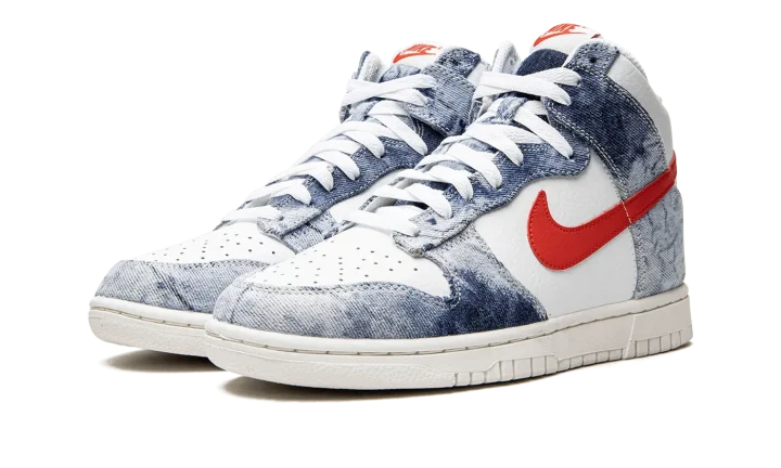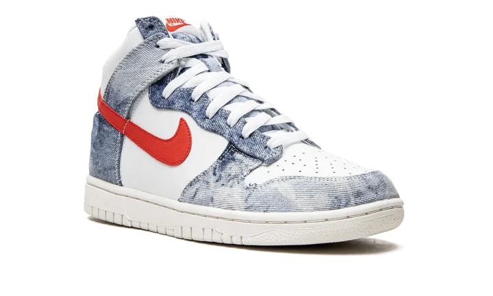 The Women's Nike Dunk High "Washed Denim" is a women's-exclusive colorway of the retro basketball shoe with a unique tie-dye, washed denim pattern on its design. A June 2022 release by Nike, the "Washed Denim" brings a warm weather-ready look to the Dunk with Washed Denim overlays against a white leather base. A Habanero Red leather Swoosh appears on either side of the shoe. Additional red accenting comes into play on the "Nike" and Swoosh logos found on the white nylon tongue tag. Underfoot, a cream rubber sole completes the look. Release date: June 29, 2022