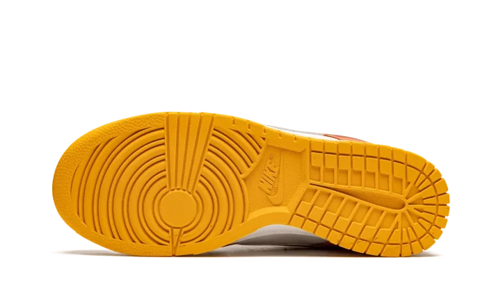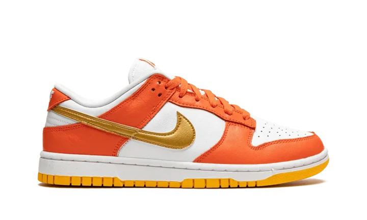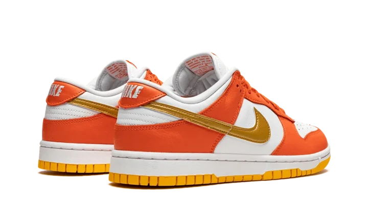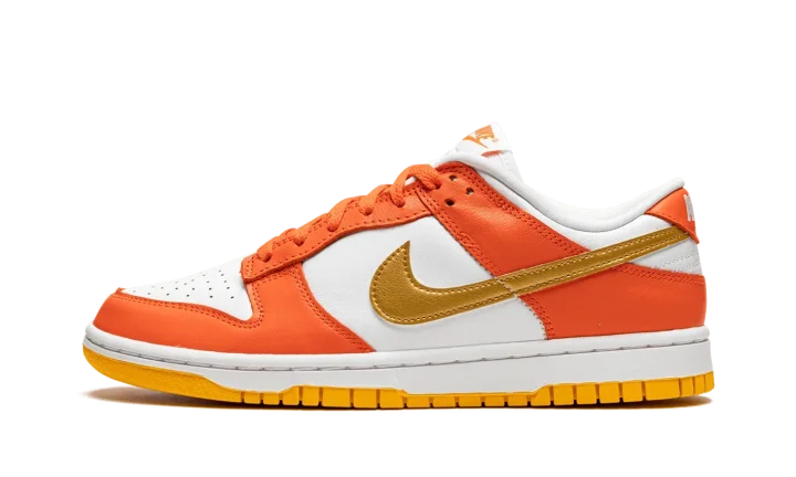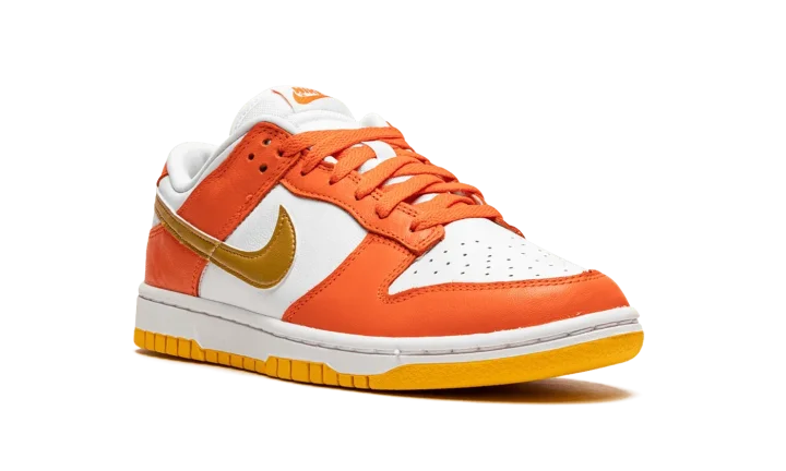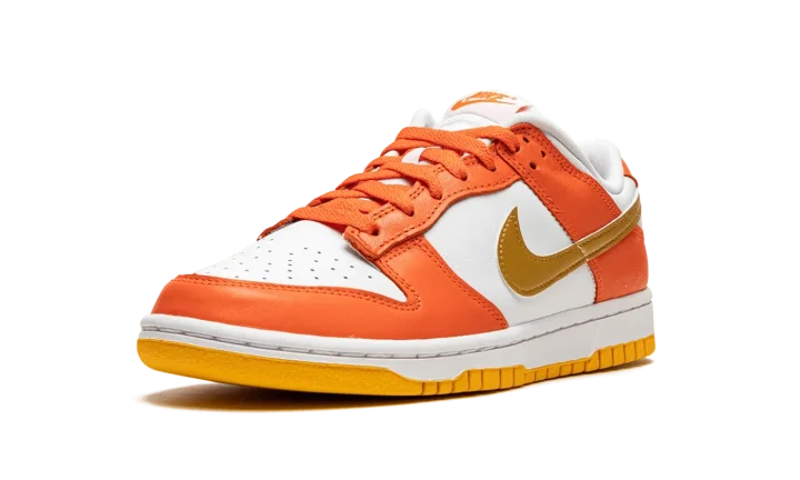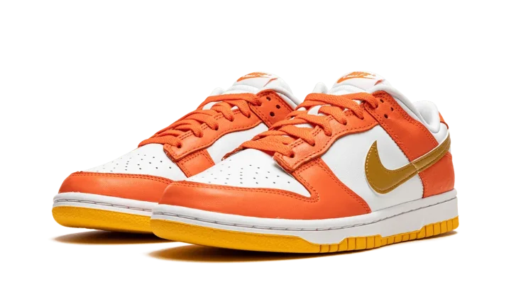 The Women's Nike Dunk Low "Golden Orange" is a women's-exclusive version of the retro basketball shoe in a colorway based on an original option from 1985. The shoe in question is the "Syracuse" Dunk High, a white and orange colorway from the college basketball-inspired "Be True to Your School" collection. Like the "Syracuse," the "Golden Orange" features a white leather base with contrasting orange leather overlays. Unlike the "Syracuse," the "Golden Orange" dons a Golden Orange-colored leather Swoosh on either side. Other details include a white "Nike" logo on the heel and an orange "Nike" insignia on the tongue tag, orange laces, and a white nylon tongue. The look is rounded into form with a white midsole and Golden Orange rubber outsole. Release date: November 27, 2021