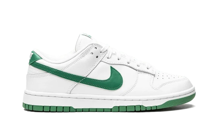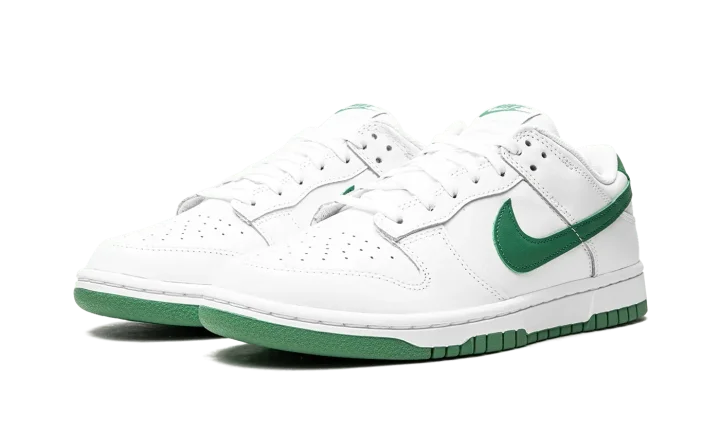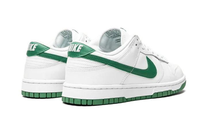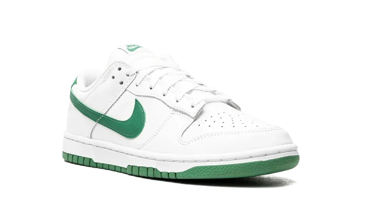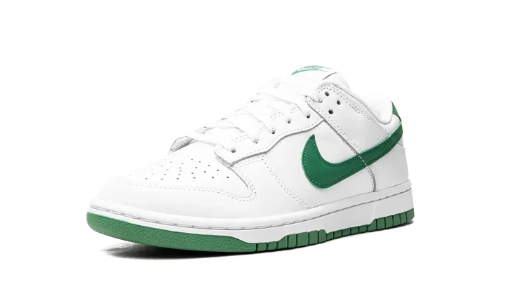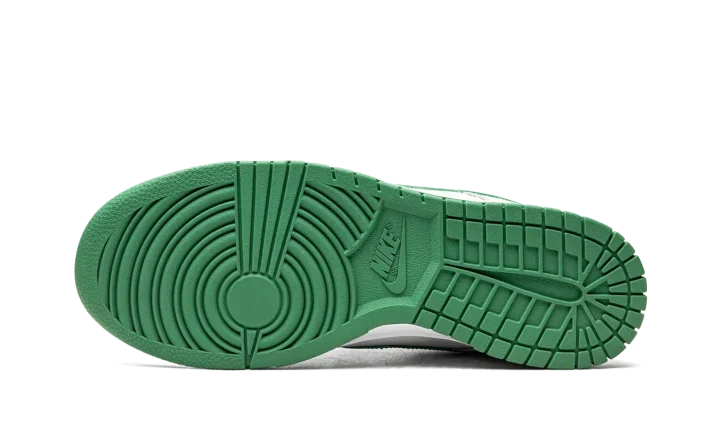 The Women's Nike Dunk Low "Green Noise" is a women's version of the vintage basketball shoe is a classic white-and-green color block. Perhaps showing love to the Boston Celtics with its white-and-green color scheme that mimics the look of the C's team uniform colors, the "Green Noise" is a clean and casual look that brings a retro vibe to any outfit. The entire upper of the shoe appears in white leather, save for the Green Noise-colored leather Swoosh on the sides and the green leather heel tab with white "Nike" branding. The white nylon tongue and white laces continue the shoe's predominantly monochromatic white appearance. Nike adds timeless branding to the Green Noise nylon tongue tag. The shoe rides on a white midsole and green outsole. Release date: November 13, 2021