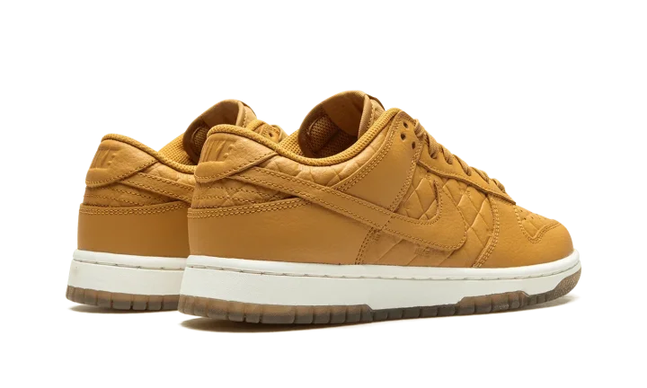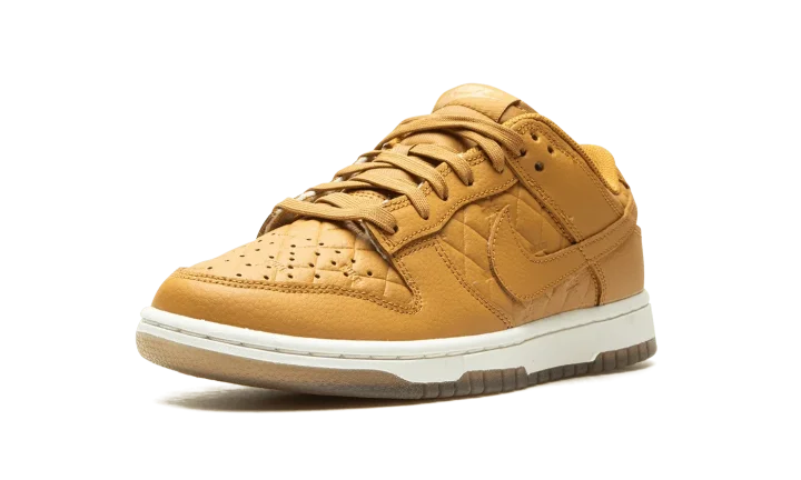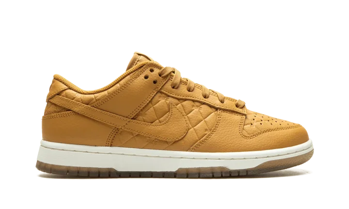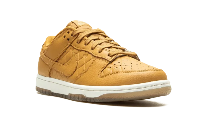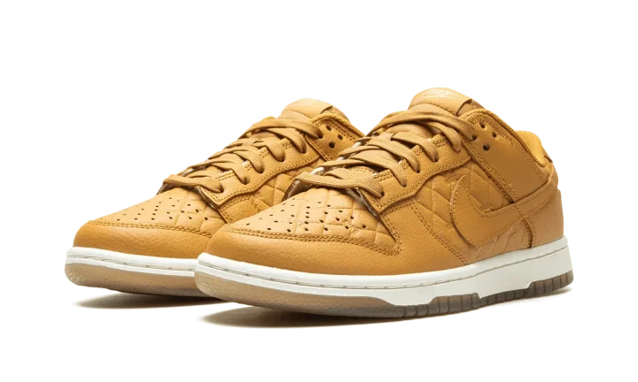 The Women's Nike Dunk Low "Quilted Wheat" is a women's-exclusive release of the retro basketball shoe in a fall-ready colorway. The "Quilted Wheat" puts an exciting remix on the beloved, autumn-inspired "Wheat" theme with faux quilted leather on the perforated toe, mid-panel, collar, and heel. Tonal Wheat-colored leather appears on the overlays and Swoosh branding. Debossed "Nike" branding is found on the heel, and signature "Nike" and Swoosh logos appear on the tongue tag. The shoe is complete with a white rubber midsole and translucent gum outsole. Release date: October 5, 2022