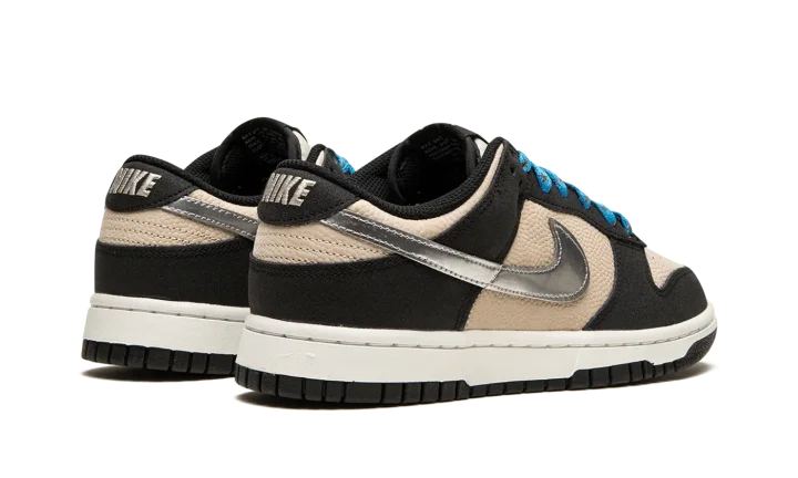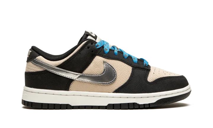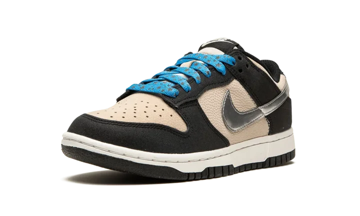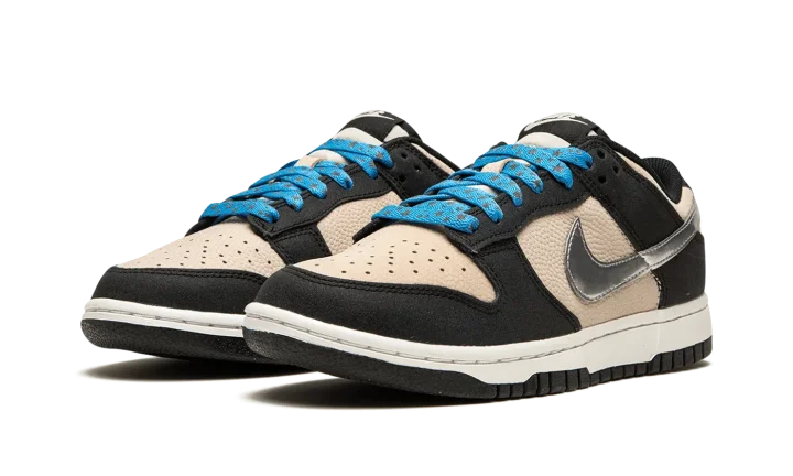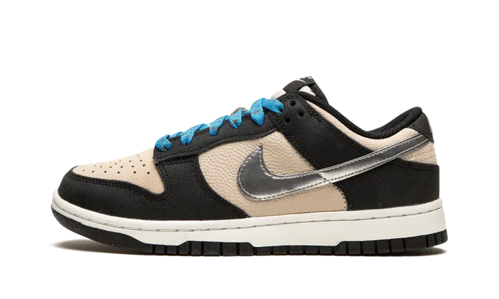 The Women's Nike Dunk Low "Starry Laces" is a women's-exclusive colorway of the vintage basketball shoe with a decidedly premium-looking design. As its name suggests, the "Starry Laces" version of the Dunk Low features laces with an added star motif that implies a casual vibe. As for the rest of the shoe, the base is designed in Light Bone leather while the overlays are rendered in a black synthetic leather. A Metallic Silver Swoosh appears on the mid-panel. "Nike" branding is embroidered in gold lettering on the heel.
