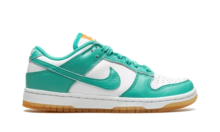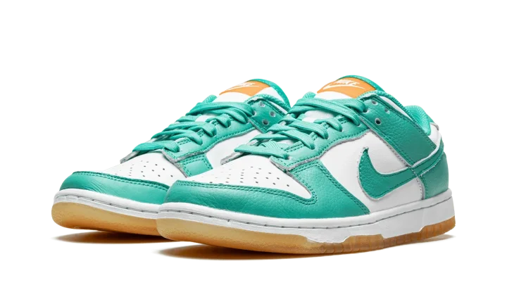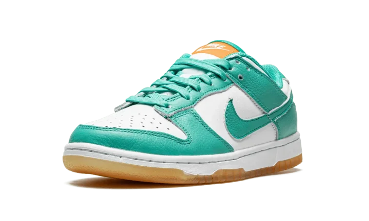 The Women's Nike Dunk Low "Teal Zeal" is a women's-exclusive colorway of the vintage basketball and lifestyle shoe that was released in July 2022. A summer-ready colorway, the "Teal Zeal" features an appealing combination of white leather on its base, and Teal Zeal-colored leather on its overlays and Swoosh branding. A white "Nike" logo is embroidered on the heel. An orange tongue tag with "Nike Dunk" branding contrasts the look of the white tongue. Teal Zeal laces continue the shoe's bold style. Underfoot, a white rubber midsole and gum outsole complete the design. Release date: July 13, 2022