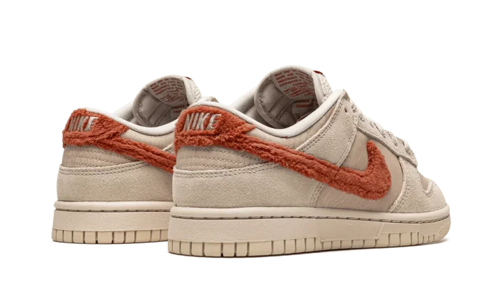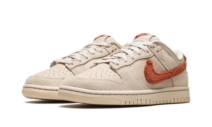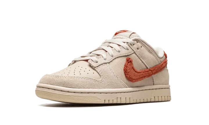 The Women's Nike Dunk Low "Terry Swoosh" is a women's-exclusive colorway of the popular skate and lifestyle shoe that modifies its design with a terry cloth Swoosh. True to its nickname, the "Terry Swoosh" Dunk Low features a Mars Stone (dark red) terry cloth Swoosh logo on either side of its Sanddrift base. Tonal suede overlays are found on the toe, forefoot, eyelets, and heel. Additional orange terry cloth fabric appears on the heel. A classic "Nike" logo is paired with a Swoosh hit on the tongue tag. A Sanddrift-colored rubber midsole and outsole completes the look. Release date: December 1, 2022