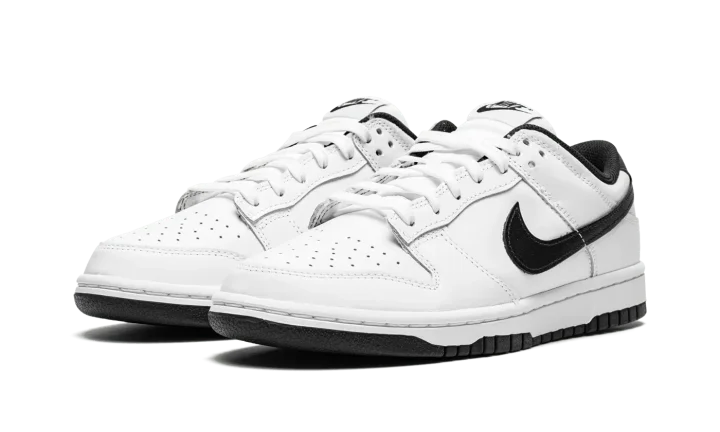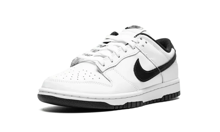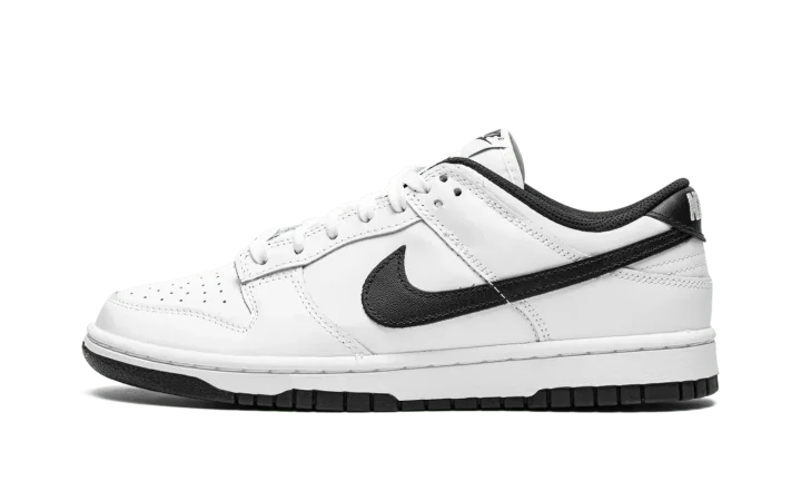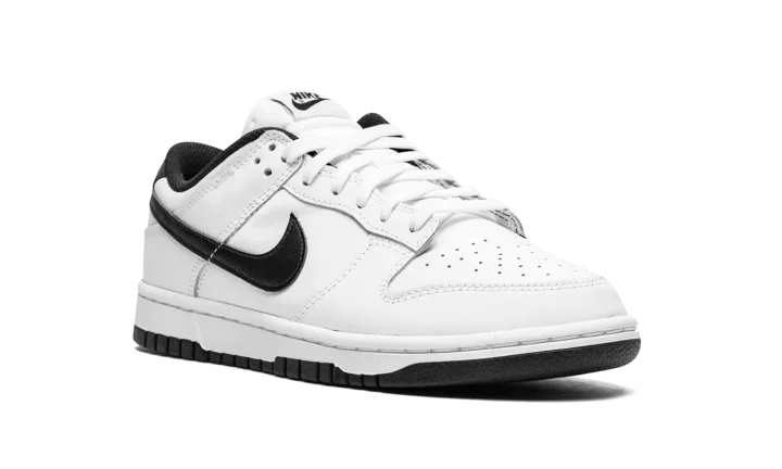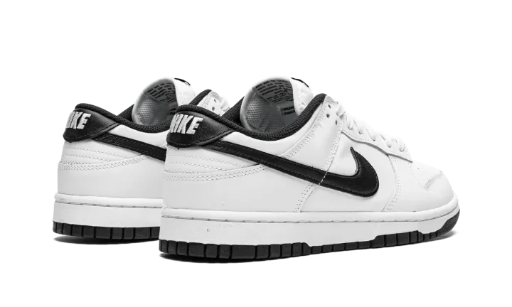 The Women's Nike Dunk Low "White/Black" is a two-tone, white-and-black colorway of the vintage basketball shoe in women's sizing that excels in versatility. The "White/Black" was released in February 2022 and features the Dunk's classic "Black/White" or "Panda" color scheme in an interesting new arrangement. The shoe's upper is constructed in white leather, including the perforated toe, overlay panels, collar, and heel. A black leather Swoosh is found on both sides. On the heel, a black leather tab with white "Nike" and Swoosh branding balances out the shoe's mostly monochromatic white appearance. A black "Nike" logo is paired with a black Swoosh on the tongue tag. White laces are layered over a white tongue. Release date: February 2, 2022