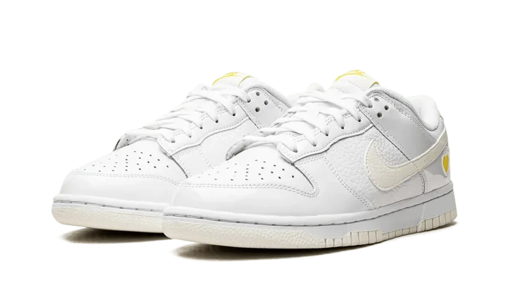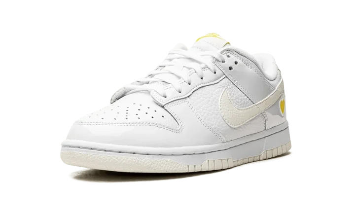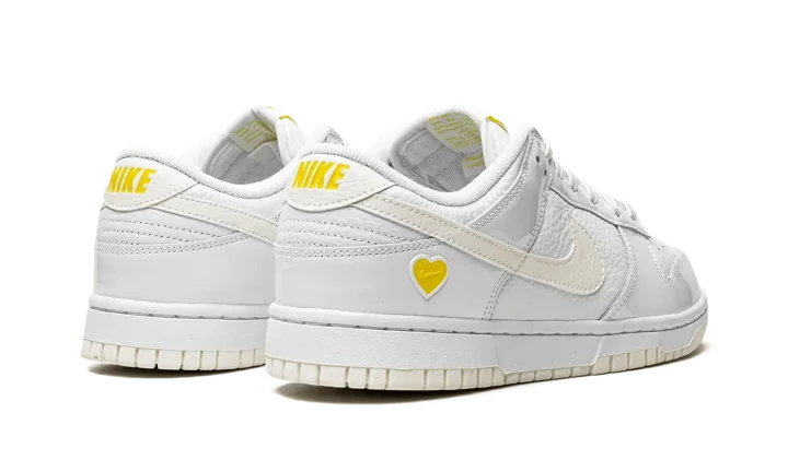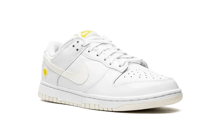 The Women's Nike Dunk Low "Yellow Heart" is a women's-exclusive colorway of the retro basketball shoe that celebrates Valentine's Day 2023. Dressed in a mostly monochromatic white colorway, the "Yellow Heart" has a tumbled white leather base with smooth tonal leather overlays. A Sail leather Swoosh is found on either side of the shoe. Yellow "Nike" branding is embroidered on the heel and classic "Nike" and Swoosh detailing appears on the tongue tag. A yellow heart emblem is found on the lateral side of the shoe. Release date: February 14, 2023