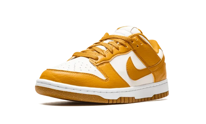 The Women's Nike Dunk Low Next Nature "Gold/Phantom" is a women's-exclusive edition of the lifestyle shoe made with sustainable materials. The Dunk Low Next Nature in the "Gold/Phantom" colorway features a white leather base with contrasting Gold leather overlays and Swoosh branding. "Nike" detailing is embroidered in white lettering on the heel and classic "Nike" insignia is found on the tongue. Underfoot, Nike matches the white rubber midsole with a Gold outsole made with its recycled Nike Grind material to complete the look.
