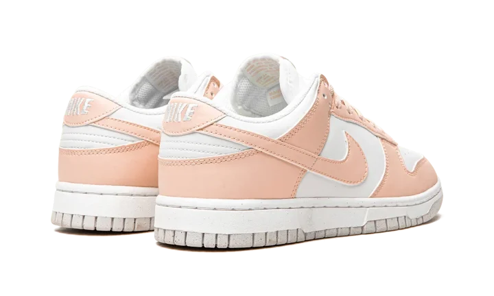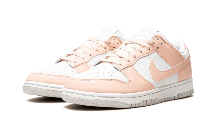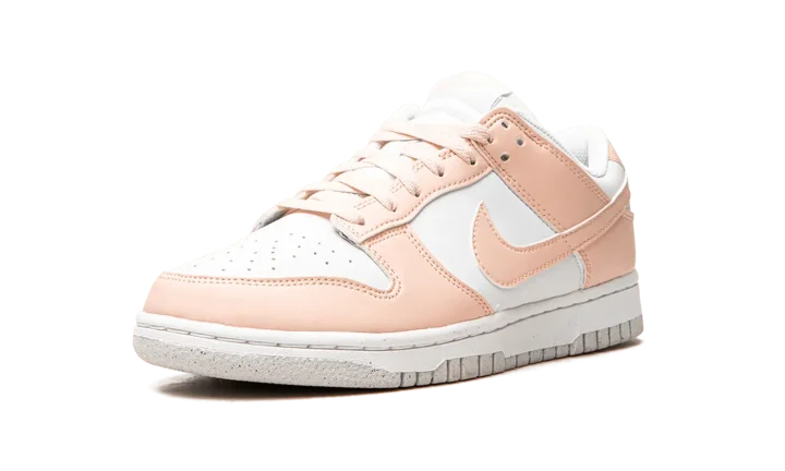 The Women's Nike Dunk Low Next Nature "Pale Coral" is an easy-wearing colorway of the vintage basketball shoe for women constructed from at least 20% recycled content by weight. The "Pale Coral" furthers Nike's "Move to Zero" initiative that aims to reduce the brand's carbon footprint. The upper features a white leather construction with contrasting Pale Coral leather overlays and Swoosh branding on the sides. A two-tone, white midsole and Pale Coral rubber outsole finish off the appealing Dunk Low for women.