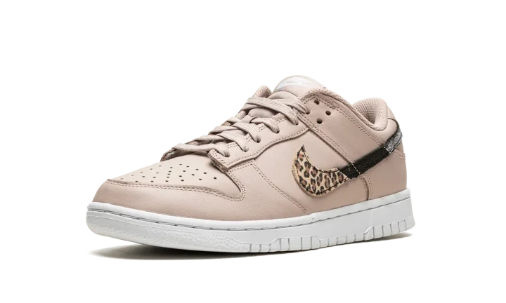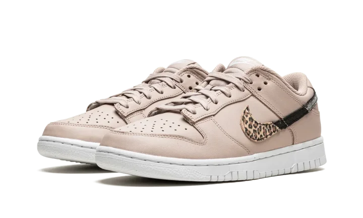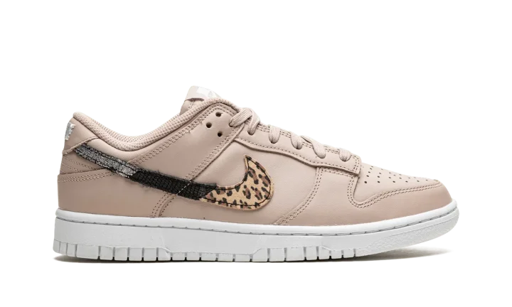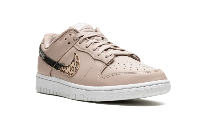The Women's Nike Dunk Low SE "Primal Pink" is a women's-only colorway of the classic basketball and lifestyle shoe that features unique animal-inspired print on its design. The "Primal Pink" captures attention with its mostly monochromatic Primal Pink-colored leather upper and multi-color Swoosh logo on either side. The branding features a split cheetah-inspired pattern contrasted with black leather. On the heel, a classic "Nike" logo is embroidered in white lettering. Additional white "Nike" and Swoosh branding is found on the tongue tag. Release date: December 22, 2021