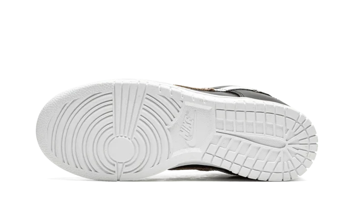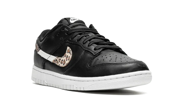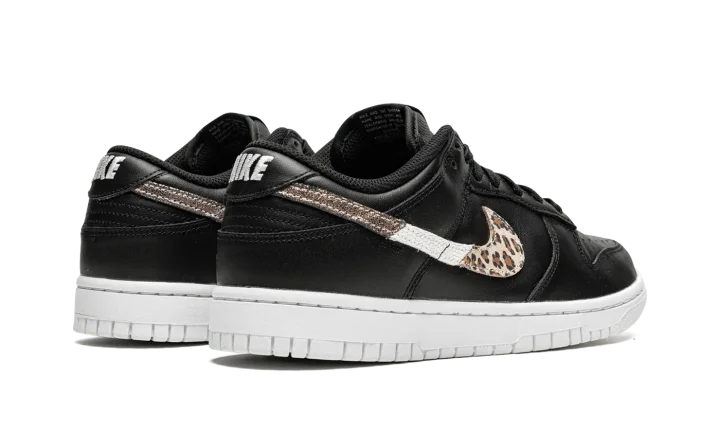 The Women's Nike Dunk Low "Animal Instinct - Black" is one of several colorways of the retro basketball shoe for women from Nike's "Animal Instinct" collection that incorporates three different animal patterns on its design. The "Black" based colorway features an all-black leather upper with a Swoosh that displays leopard print, grey snakeskin, and bronze patterns. A white "Nike" logo is embroidered on the heel and white "Nike" and Swoosh detailing is found on the black tag on the black nylon tongue. The look is finished off with a white rubber midsole and black outsole. Release date: September 18, 2021