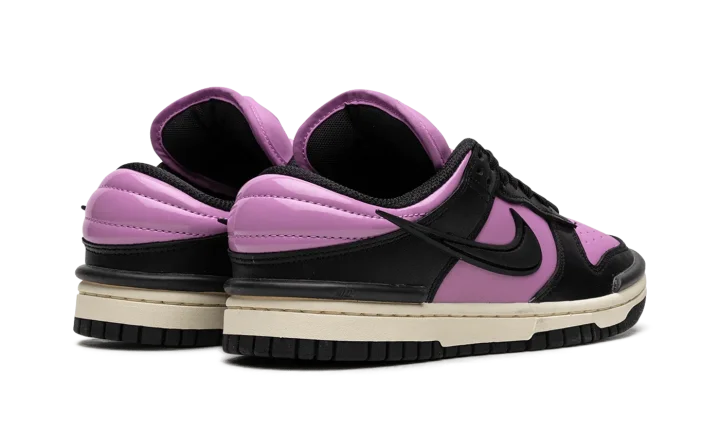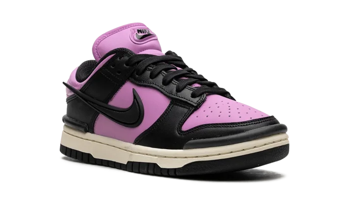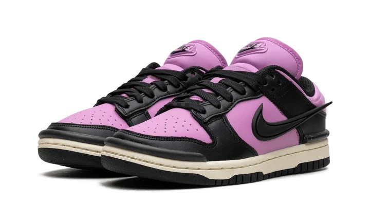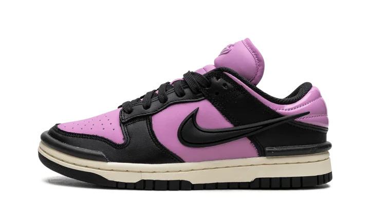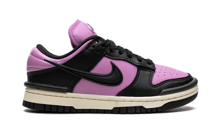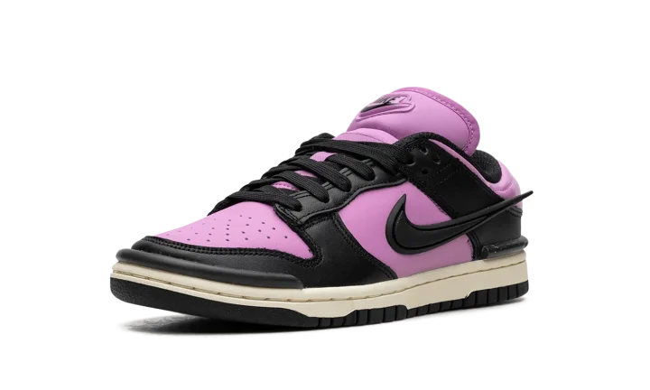 The Women's Nike Dunk Low Twist "Rush Fuchsia" is a women's colorway of the retro basketball shoe with an eye-catching, two-tone appearance. The Dunk Low Twist modifies the Dunk's silhouette with unique branding elements. The colorway features a Rush Fuchsia leather base with contrasting black leather overlays and a black detached Swoosh on the side. A raised "Nike" logo is found on the tongue. Underfoot, a white rubber midsole and black rubber outsole round out the bold look. Release date: October 1, 2023