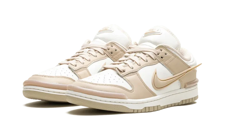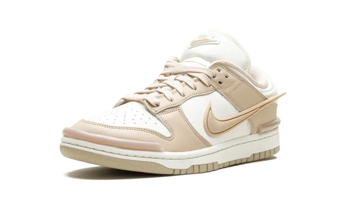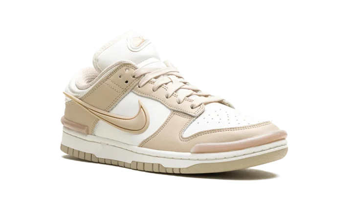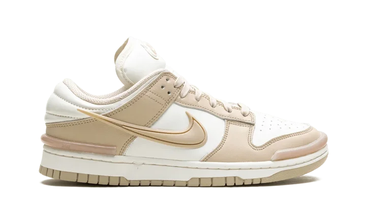The Women's Nike Dunk Low Twist "Sanddrift" is a women's-exclusive colorway of the retro sneaker with a contemporary spin. The Dunk Low Twist modifies the Dunk's design with unique details, including bumpers on the toe and heel and a partially detached Swoosh. On the "Sanddrift," the shoe has a white leather base with Sanddrift, or tan, leather overlay panels. Two plastic "bumpers" are found on the front and back of the shoe above the rubber midsole. A puffy Nike logo is found on the tongue.