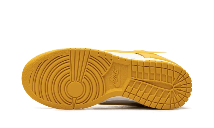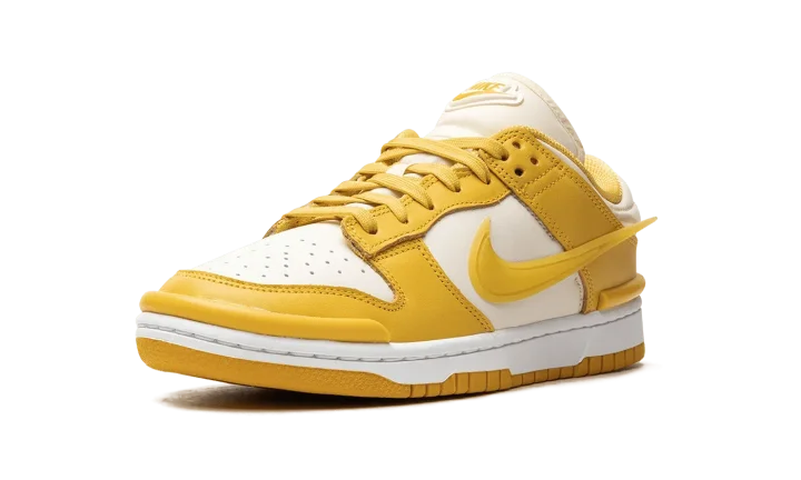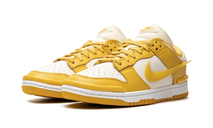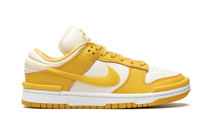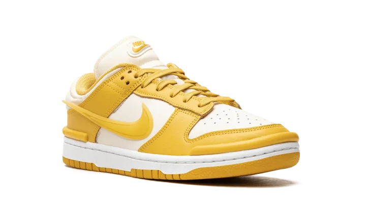 The Women's Nike Dunk Low Twist "Vivid Sulfur" is a women's-exclusive colorway of the retro basketball sneaker with a modified design. The Dunk Low Twist updates the classic shoe's look with unique features that include bumpers on the toe and heel, and detached Swooshes on the sides. A Coconut Milk-colored leather base is paired with Vivid Sulfur leather overlays. A raised "Nike" logo is seen on the tongue. A white rubber midsole and orange rubber outsole complete this eye-catching Dunk.