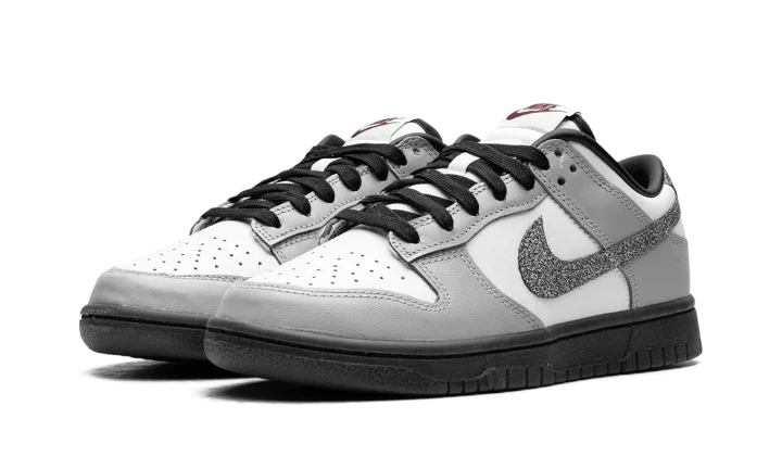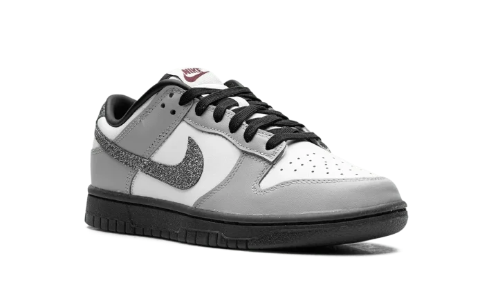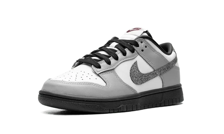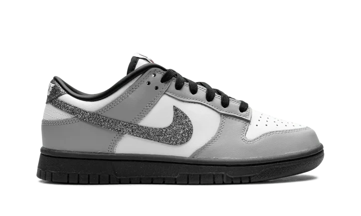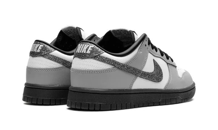 The Nike Women's Dunk Low LX 'Glitter Swoosh' carries a smooth leather upper, featuring a stark white base with grey overlays at the forefoot and heel. Glittery accents make their way to the signature Swoosh and back tab.