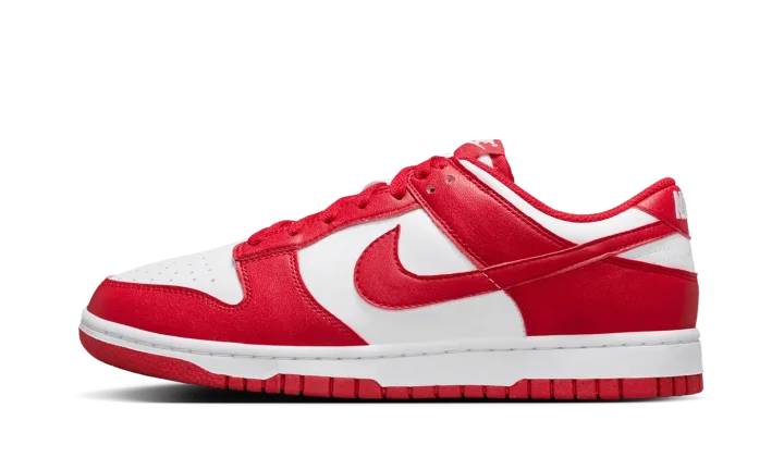 The Nike Women's Dunk Low Next Nature 'St. John's' combines a crisp white base with University Red overlays and a color-matched Swoosh.