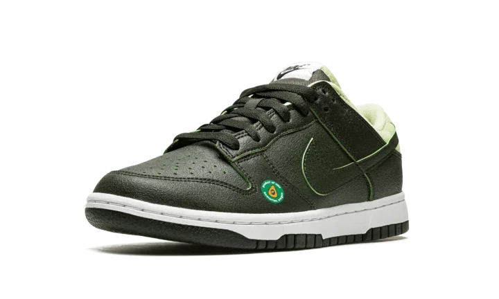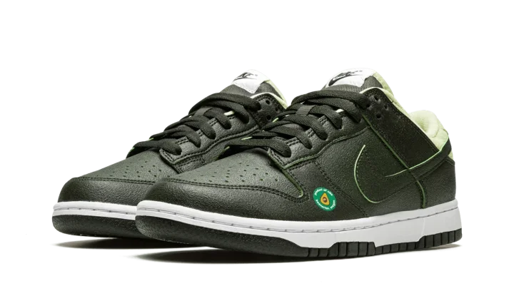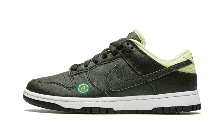 Nike nods to a popular food with the Women's Nike Dunk Low "Avocado." The shoe features a textured dark green base, similar to the outer skin of an avocado, paired with green contrasting accents resembling the inside of the fruit. Additional details include an avocado "sticker" on the lateral forefoot and insole along with a Nutrition Facts tag hiding on the inner side of the tongue tag. The "Avocado" Dunks come housed in a special packaging along with mesh shopping bag.