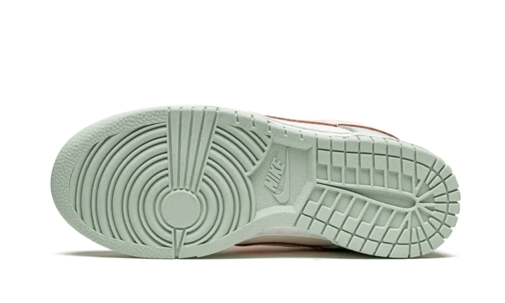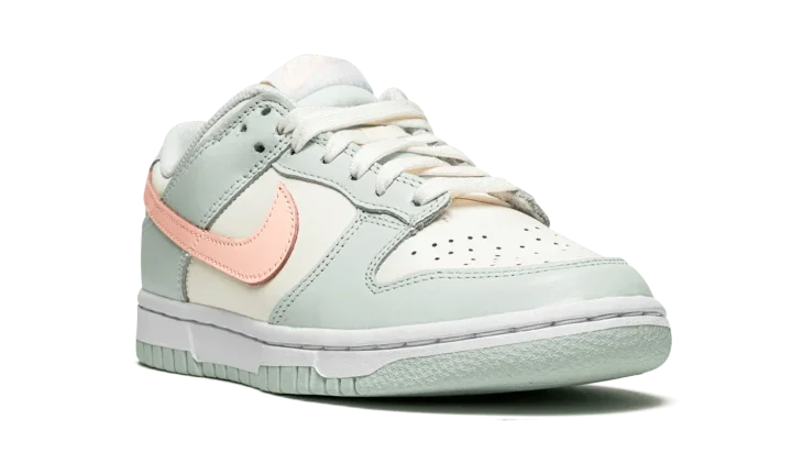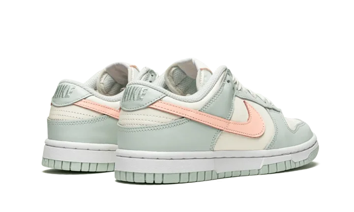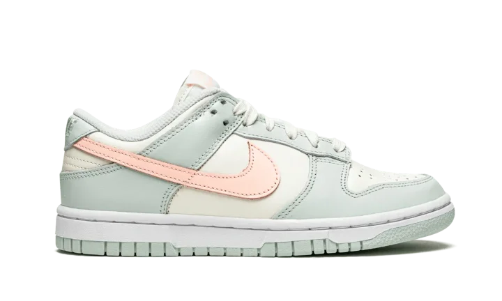 The Women's Nike Dunk Low "Barely Green" is a women's edition of the classic basketball and lifestyle shoe in an appealing colorway perfect for spring and summer. Released in May 2021, the "Barely Green" is yet another soothing design for the enduring low-top shoe for women. The colorway features a light green shade that Nike calls "Barely Green" on the leather panels of the forefoot, eyelets, collar, and heel. The perforated toe, collar, and the mid-panel are dressed in a cream-colored leather. A Peach leather Swoosh appears on both sides and tonal "Nike" branding is embroidered on the heel. A peach-colored "Nike" tongue tag is stitched onto the green nylon tongue. A white rubber midsole and Barely Green outsole round out the look. Release date: May 21, 2021.