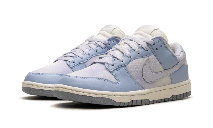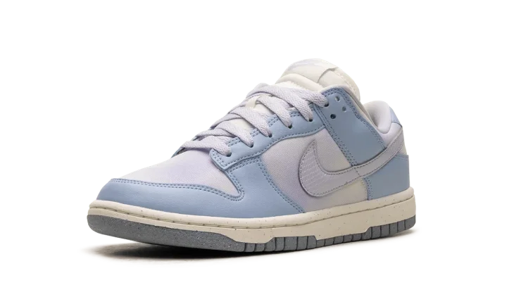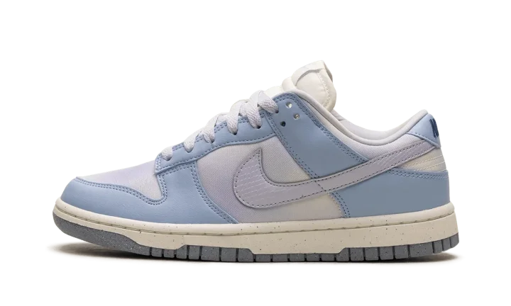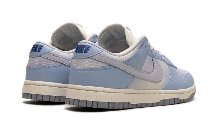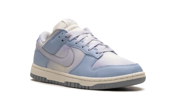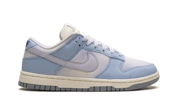 The Women's Nike Dunk Low "Blue Airbrush" is a women's-exclusive colorway of the classic sneaker with a unique airbrush finish. The toe and the mid-panel of the canvas upper feature a blue airbrush effect, while the collar and heel appear in Sail-colored canvas. The leather overlays are designed in a Cobalt Blue hue. A blue airbrush finish is applied to the Swoosh. Classic "Nike" branding appears on both the heel tab and tongue tag. Underfoot, a speckled aged midsole completes the look.