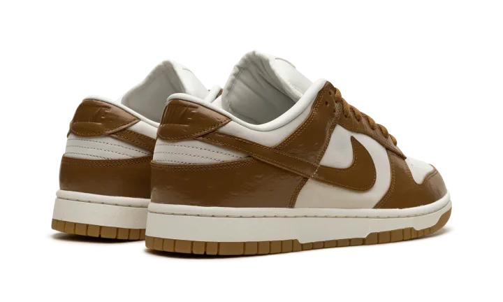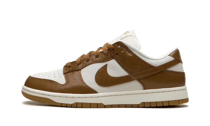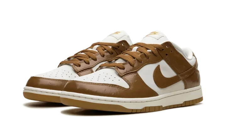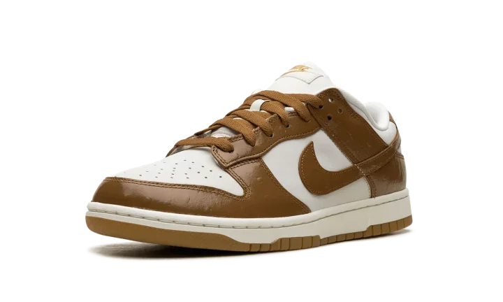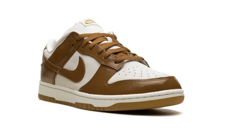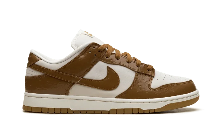 The Women's Nike Dunk Low LX "Brown Ostrich" is a women's-exclusive colorway of the retro basketball shoe with eye-catching faux ostrich leather. The "Brown Ostrich" Dunk Low LX has an undeniably premium look with ostrich leather panels in an Ale Brown hue complemented with a white leather base. A debossed "Nike" logo appears on the heel and gold "Nike" and Swoosh logos can be found on the tongue tag. Underfoot, a white rubber midsole and Ale Brown rubber outsole complete the look.