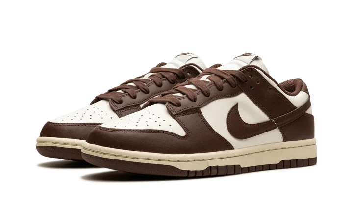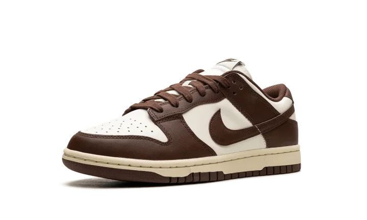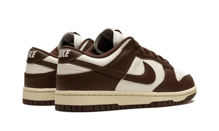 The Women's Nike Dunk Low "Cacao Wow" is a women's-exclusive colorway of the retro basketball shoe with an old school look. Called the "Cacao Wow" colorway by Nike, this Dunk Low features an off-white white upper with Cacao Wow, or brown, leather overlays and Swoosh branding. Classic "Nike" branding is embroidered on the back of the collar and "Nike" and Swoosh branding are found on the tongue tag. Underfoot, the shoe's aged-looking midsole gives the silhouette a classic, vintage look.
