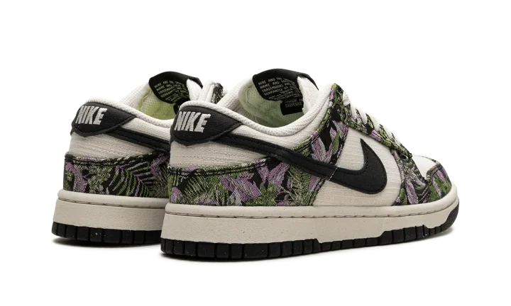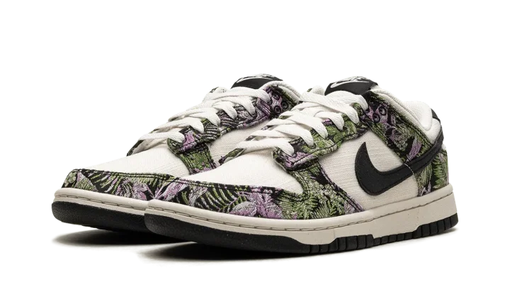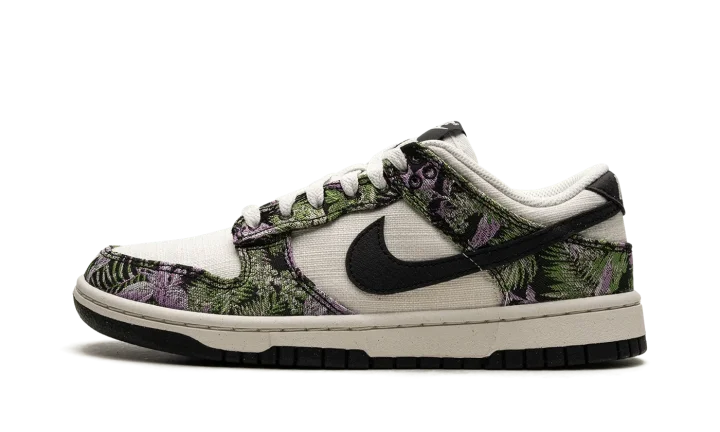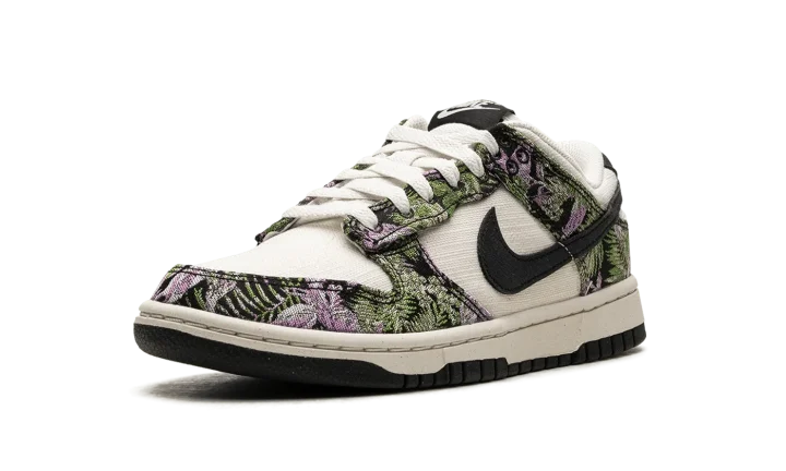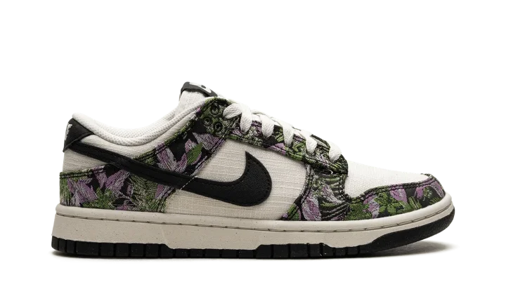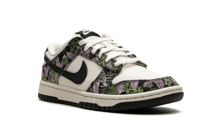 The Women's Nike Dunk Low "Floral Tapestry" is a women's-exclusive colorway of the retro basketball shoe made from recycled materials. The upper features a Pale Vanilla-colored, hemp-like material for the base with floral-patterned woven canvas overlays. A black leather Swoosh appears on either side of the shoe. Classic "Nike" branding is embroidered on the heel and printed on the tongue tag. The shoe is made from recycled content. Release date: September 18, 2023