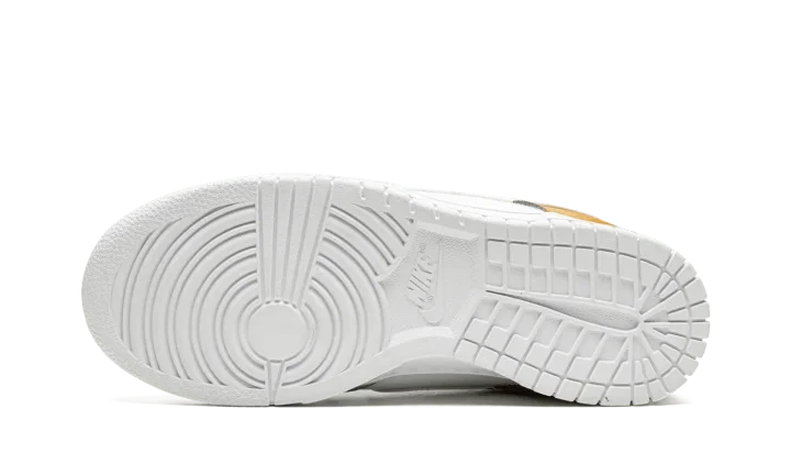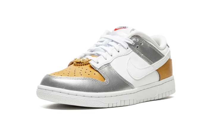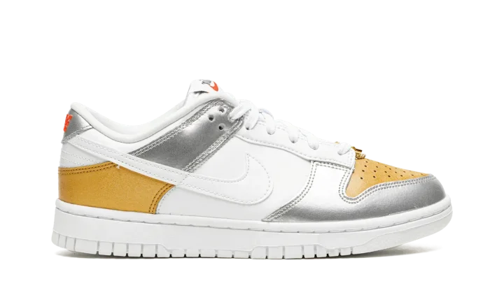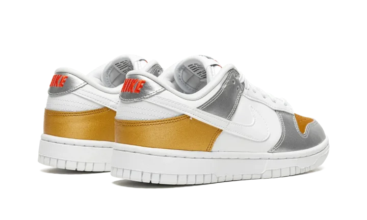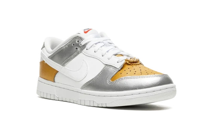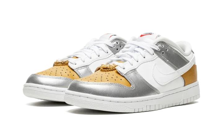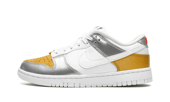 The Women's Nike Dunk Low "Gold/White/Silver" is a women's-exclusive colorway of the sneaker that combines flashy metallic gold and silver overlays against a clean white base. Nike released the Dunk in "Gold/White/Silver" in February 2022 as part of its Spring 2022 footwear lineup. The perforated toe and heel overlay are designed in Metallic Gold. The eyelets, mid-panel, and top heel block appear in crisp white tumbled leather. Contrasting Metallic Silver leather is found on the toe cap and forefoot panels, as well as on the collar and heel tab with red "Nike" branding. Classic "Nike" script detailing appears with a black Swoosh on the tongue tag. A luxury-inspired gold chain "Nike" lace dubrae on the vamp completes the look. Release date: February 7, 2022