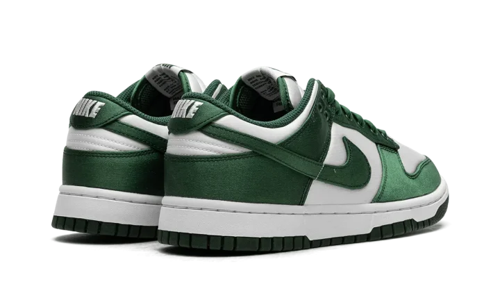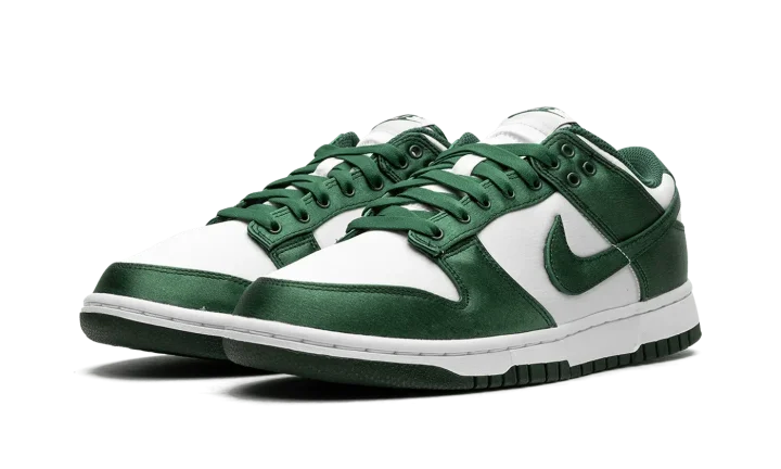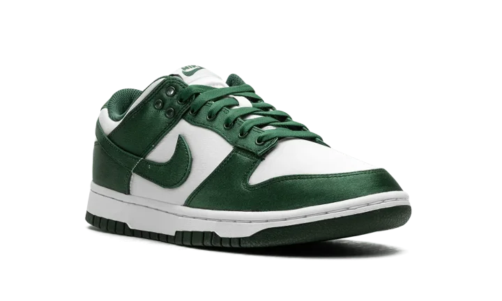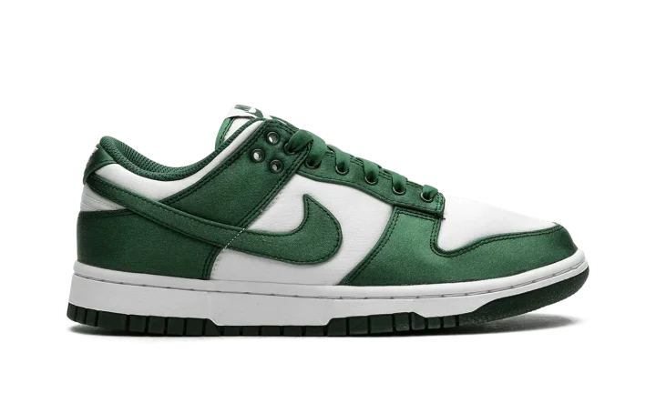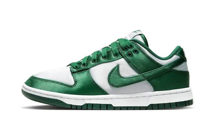The Women's Nike Dunk Low "Green Satin" is a women's-exclusive colorway of the retro basketball shoe with satin details. Just as its name suggests, the "Green Satin" Dunk Low features satin material on its design, which gives the popular shoe a premium look. The upper is complete with a white leather base with Team Green satin overlays and Swoosh branding. Classic "Nike" detailing is seen on the heel and on the tongue tag. Underfoot, a white rubber midsole and green outsole complete the look. Release date: August 11, 2023