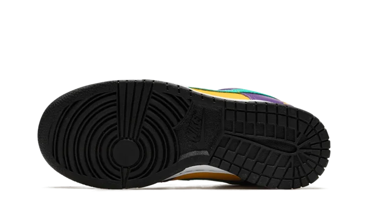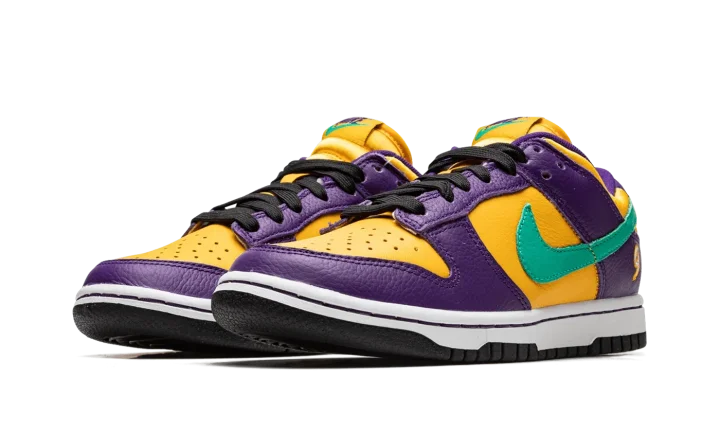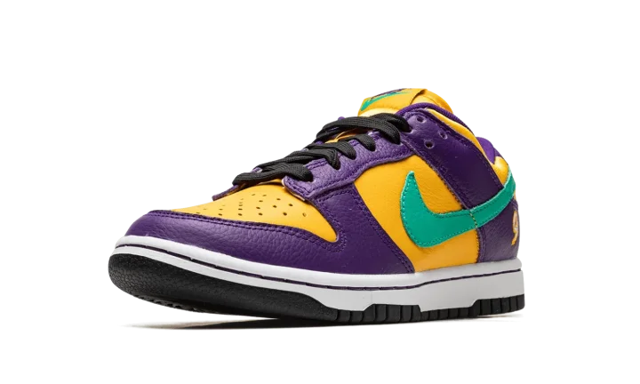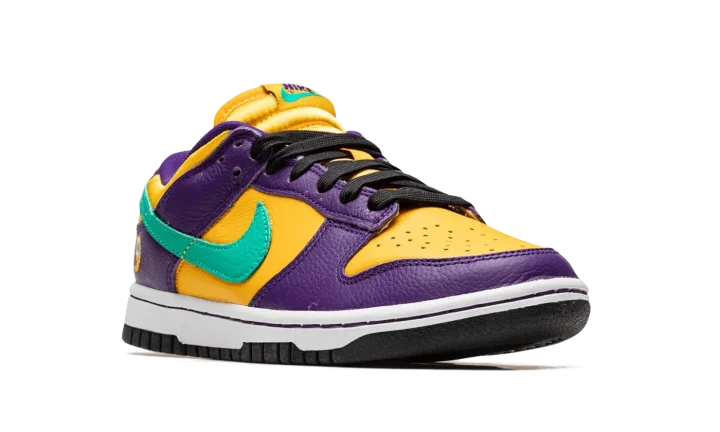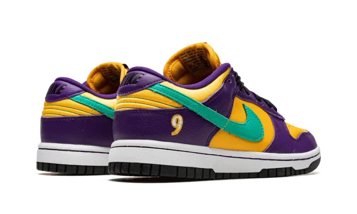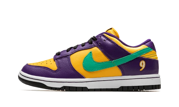 The Nike Dunk Low "Lisa Leslie" is a special edition colorway that celebrates the 20th anniversary of the legendary Los Angeles Sparks' basketball player who became the first woman to dunk in a WNBA game. Leslie, who was an original member of the Sparks and WNBA from the league's beginning in 1997, is immortalized on the Dunk by combining the Sparks' team uniform colors with her "9" jersey number on its design. Specifically, the perforated toe, mid-panel, collar, and heel are designed in yellow leather. The overlays appear in purple leather. A green leather Swoosh is found on either side. As mentioned, Leslie's "9" jersey number is embroidered on the lateral side of the heel. Classic "Nike" branding is found on both the heel and tongue tag. Release date: July 9, 2022