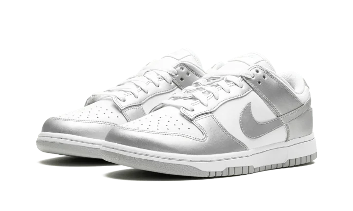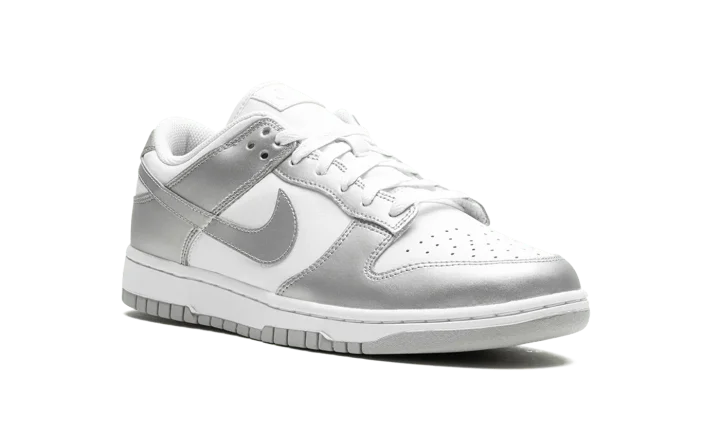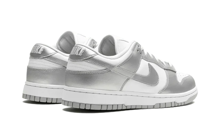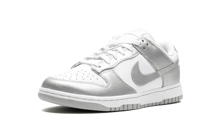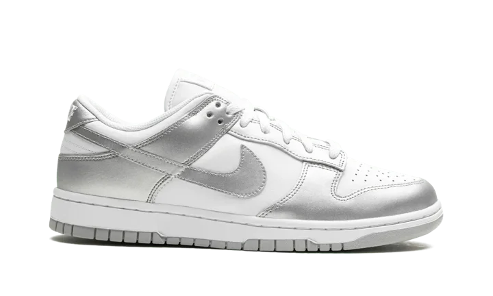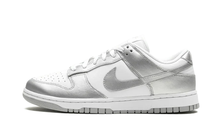 The Nike Dunk Low Metallic Silver (Women's) is a basketball-turned-skateboarding shoe in women's sizing with a metallic color scheme.