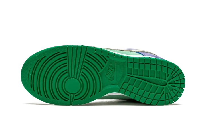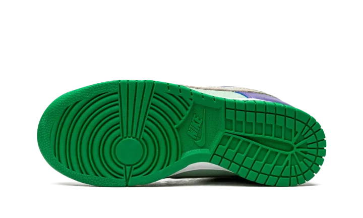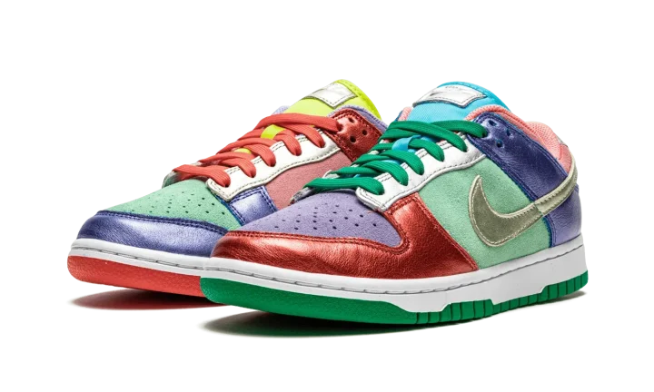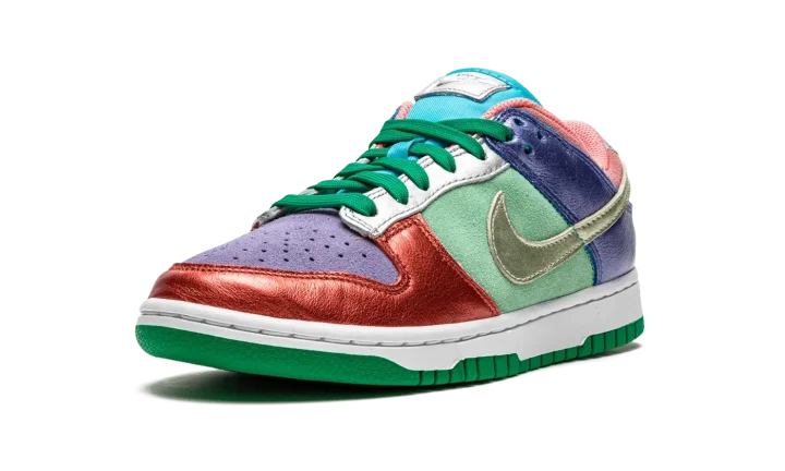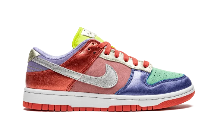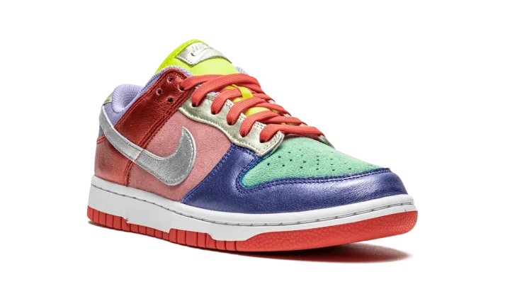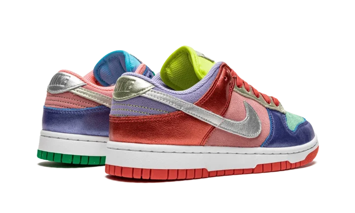The Women's Nike Dunk Low "Sunset Pulse" is a women's exclusive colorway of the venerable lifestyle silhouette that features a mismatching color block of the left and right shoe. A June 2021 release, the "Sunset Pulse" is one of several Dunk releases for women that features a vibrant mixture of colors. On the left shoe, both the toe cap and forefoot display a glossy metallic red leather construction. The perforated toe and mid-panel are cast in lavender and mint green suede, respectively. A metallic royal blue leather panel can be found on the collar and pink suede appears on the heel. A metallic silver leather Swoosh graces both sides of the left shoe. The color block is rearranged on the right shoe. Metallic blue leather appears on the toe cap and forefoot. The perforated toe and mid-panel display a mint green and suede construction, respectively. A metallic red leather panel breaks up the look on the collar and lavender suede dots the heel. Just as it does on the left shoe, a metallic silver Swoosh appears on both sides of the right shoe. The left shoe has a light blue leather tongue with green laces and the right shoe features a yellow leather tongue with red laces. Release date: June 10, 2021.