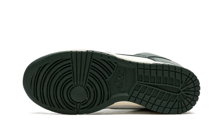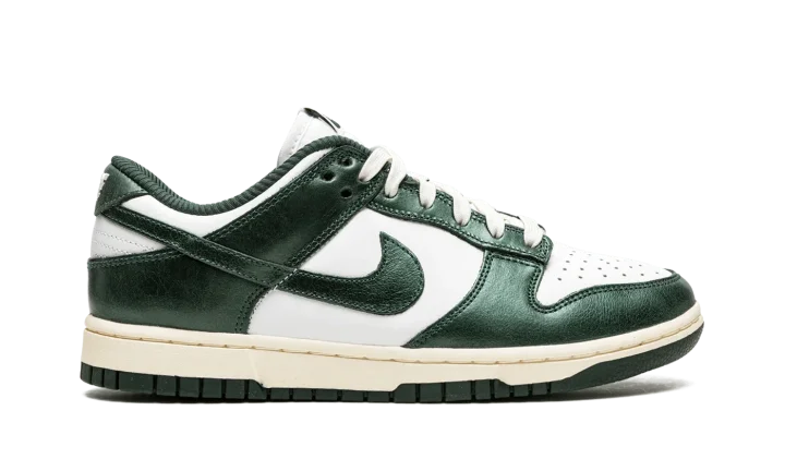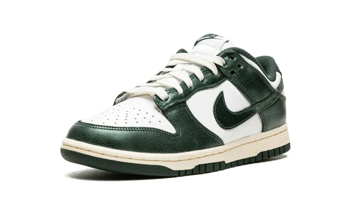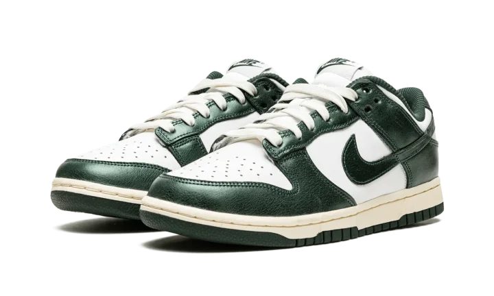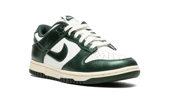The Women's Nike Dunk Low "Vintage Green" is a women's-exclusive colorway of the classic sneaker with a collegiate flair. While not officially associated with the school, the "Vintage Green" is reminiscent of the Michigan State Spartans college basketball team, as it features the same green and white colors on its design as the Spartans' team uniforms. Moreover, the "Vintage Green" honors the Dunk's storied history as a mid-1980s college basketball team shoe with its aged, vintage look. The cream rubber midsole mimics the oxidation process rubber undergoes after years of use. Up top, the shoe features a white leather base. The Vintage Green leather overlays and Swoosh branding have a slight sheen and textured finish that mimics the look and feel of vintage leather. Cream white laces complete the throwback-inspired look.