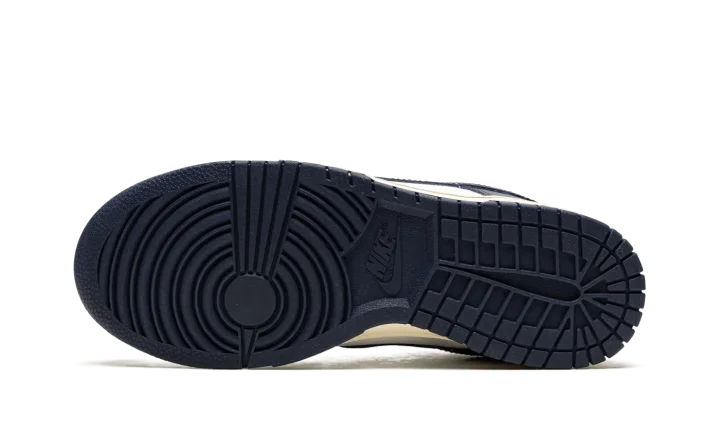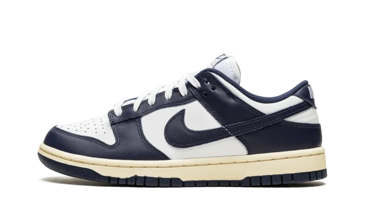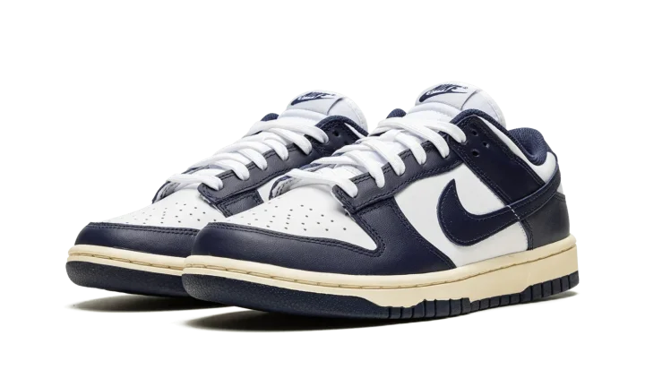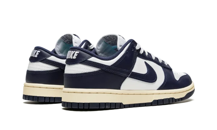 The Nike Dunk Low "Vintage Navy" is a classic two-tone, white-and-navy colorway for the retro basketball shoe with a decidedly throwback vibe. The "Vintage Navy" edition of the Dunk Low calls back to original styles found in the "Be True to Your School" pack of college basketball-inspired colorways from 1985. The shoe's upper features a white leather base with contrasting Vintage Navy-colored leather overlays and Swoosh branding. White "Nike" branding is embroidered on the heel, and navy "Nike" and Swoosh detailing is found on the tongue tag. The shoe rides on a cream-colored rubber midsole that gives the shoe a vintage look. Underfoot, a Vintage Navy outsole completes the look. Release date: March 4, 2022
