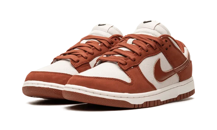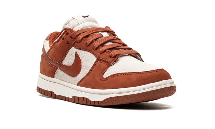 The Women's Nike Dunk Low LX "Rugged Orange" is a women's-exclusive colorway of the retro basketball and lifestyle shoe with a casual vibe. The "Rugged Orange" Dunk Low LX features a Light Orewood Brown or off-white-colored canvas base with Rugged Orange leather overlays and Swoosh branding. A "Nike" logo is embroidered on the heel and printed on the tongue tag. A cream rubber midsole and burnt orange outsole complete the look. Release date: July 12, 2023