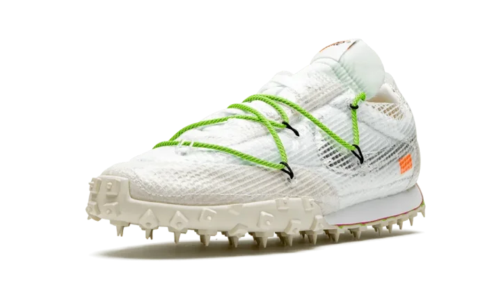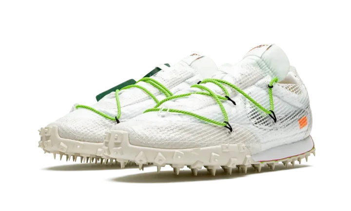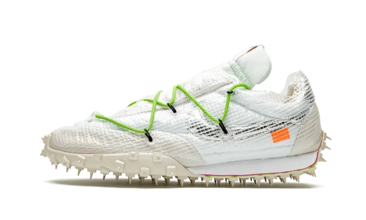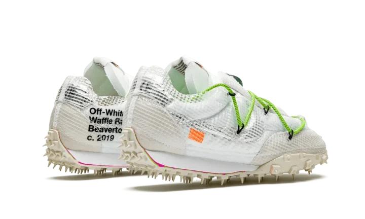 The Off-White x Nike Waffle Racer SP "Electric Green" is the women's sizing of the futuristic lifestyle sneaker imagined by Virgil Abloh and Nike. The ongoing collaboration between Abloh's fashion label and Nike has become one of the more eagerly anticipated projects in the sneaker game and this limited collection from fall 2019 including three colorways of the Waffle Racer is no different. The upper is composed of white nylon with a film-like synthetic mesh layer wrapping the entire shoe. Cream suede covers the toe, eyelets, and heel with a metallic silver Swoosh branding hit appearing on the mid-panel. Bold Electric Green laces add a pop of color to the muted tones of the upper. Completing the look of the re-imagined Waffle Racer in women's sizing is a cream colored spiked outsole that mirrors a pair of track spikes. Release date: October 24th, 2019.