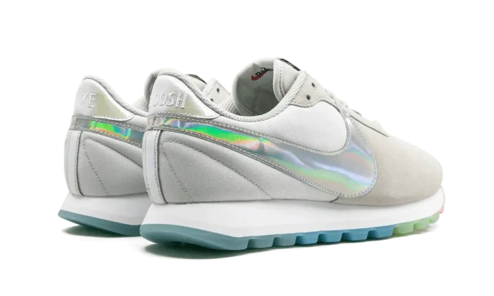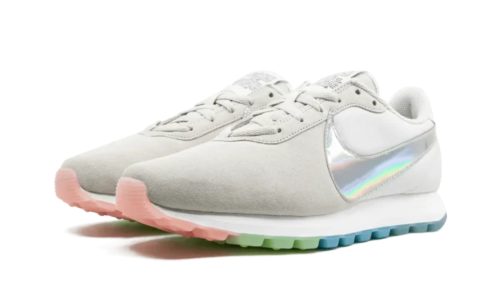 The Nike Pre Love O.X. women's shoe pays its respects to Nike running legend Steve Prefontaine. The two-piece nylon-nubuck upper construction has a shape similar to the Air Pegasus 83, and an oversized holographic midfoot Swoosh brings in distinct design. An inside-out Nike retro tongue tag displays care instructions for the shoe. "Nike" and "Swoosh" adorn the heels and the tan-colored Nike Pre Love O.X. sits atop a rainbow gradient sole that features a whimsical combo of pink, green, and blue.