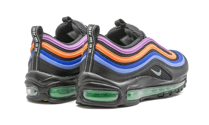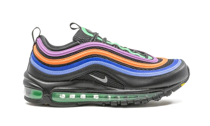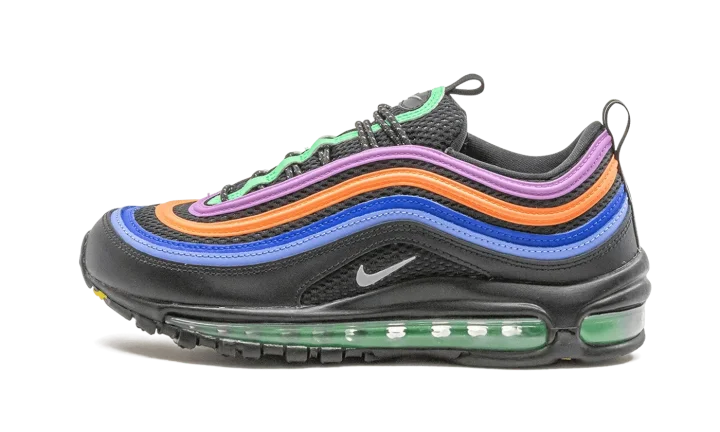 The Women's Nike Air Max 97 "Multicolor" is a women's exclusive colorway of the late retro performance and lifestyle shoe. Nike reintroduced the late '90s model to the modern sneaker audience for the Air Max 97's 20-year-anniversary in 2017. The original "Silver Bullet" colorway, along with various collaborations from the likes of Undefeated, Off-White, and more, all greatly contribute to the design's ensuing rise in popularity. Here, Nike places a rainbow-like assortment of purple, orange, royal blue, and light blue wavy leather panels atop a black mesh base. A small silver Swoosh logo can be found on the middle of the black leather heel-to-toe mudguard. Black speckled rope laces are layered over the black mesh tongue. "Air Max" branding on the pull tab on the heel gives the shoe an infusion of retro appeal. A green-tinted full-length visible Air unit in the midsole completes the look.