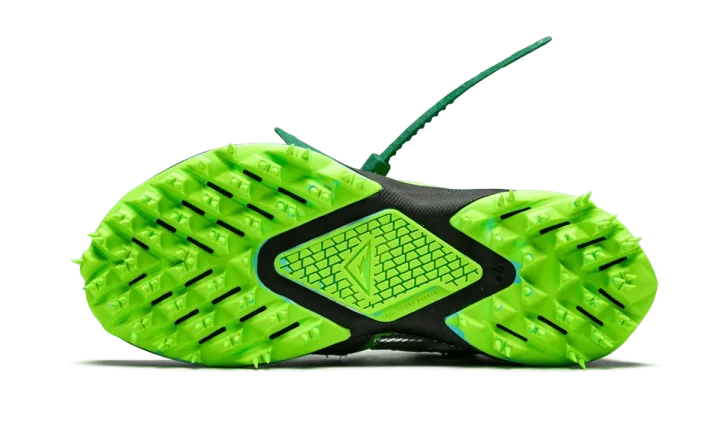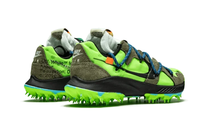 The Off-White x Zoom Terra Kiger 5 "Electric Green" is one of the three debut colorways for the unique silhouette by Virgil Abloh. The bold design features the Zoom Terra Kiger 5 trail running shoe with a radical makeover by Abloh, modified with recognizable Off-White design cues including premium materials, exposed foam on the tongue, printed text, and an orange tab. Abloh also adds a bold auxiliary lacing system and the model's most distinct detail, the spiked rubber outsole. This colorway features an Electric Green textile base with suede overlays in olive and black accents for the Swoosh branding and midsole. The spiked sole matches the neon green hue of the upper with marbled hits of bright blue mixed in. The signature Off-White zip-tie appears in green for the final touch. The Off-White x Zoom Terra Kiger 5 "Electric Green" released on June 24, 2019.