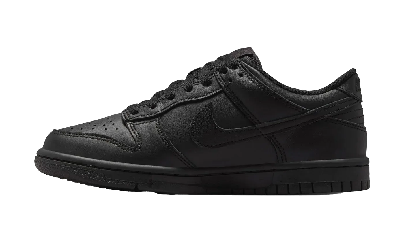 The 2025 edition of the Nike Dunk Low GS 'Triple Black' delivers a tonal black finish on the leather upper, featuring heritage details that include a perforated toe box and a breathable nylon tongue.