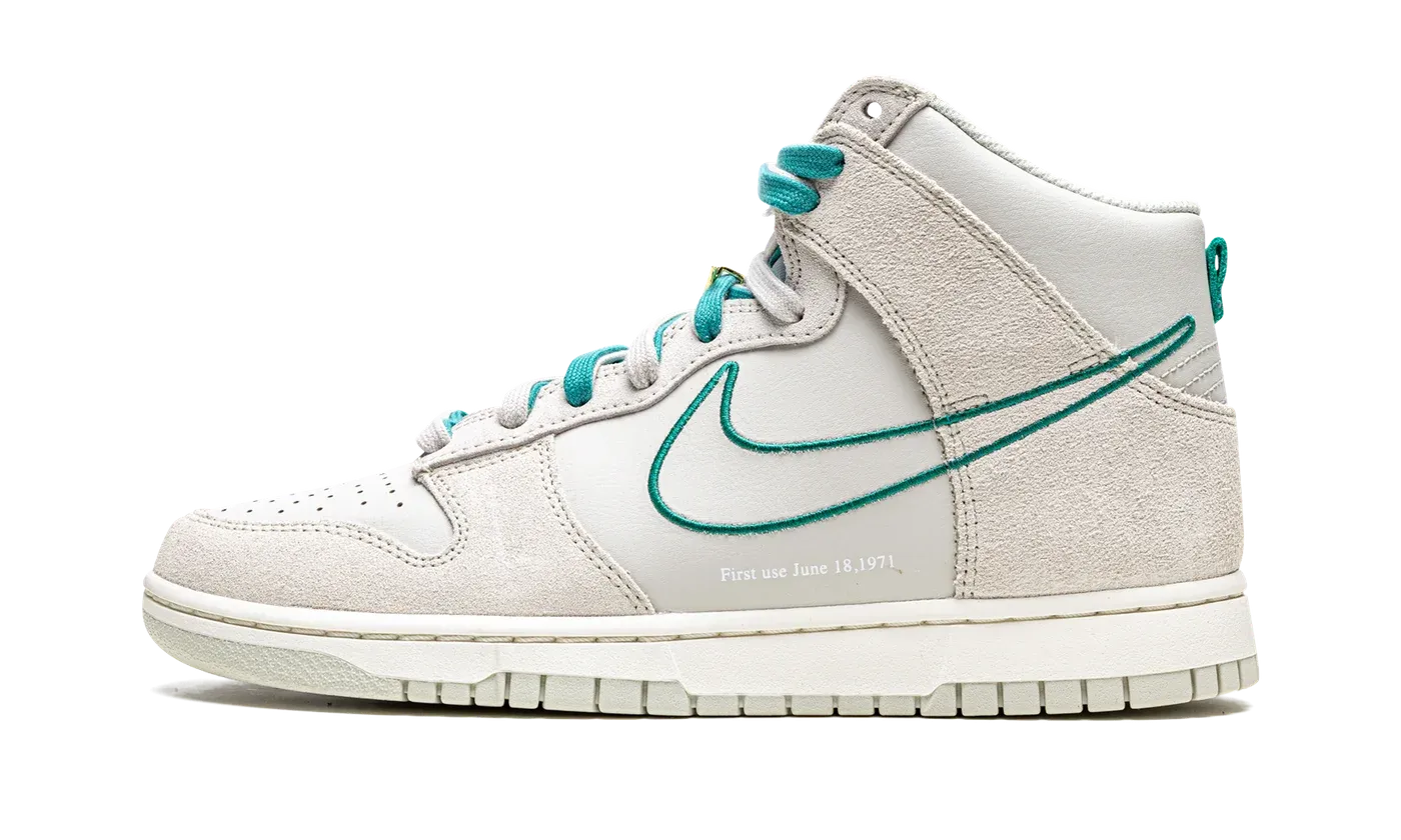 Light grey suede/leather Dunk High SE "First Use - Green Noise" sneakers from NIKE featuring signature Swoosh logo detail, contrasting panel detail, round toe, perforated detailing, front lace-up fastening, logo patch at the tongue, ankle-length, branded insole and rubber sole. These styles are supplied by a premium sneaker marketplace. Stocking only the most sought-after footwear, they source and curate some of the most hard to find sneakers from around the world..