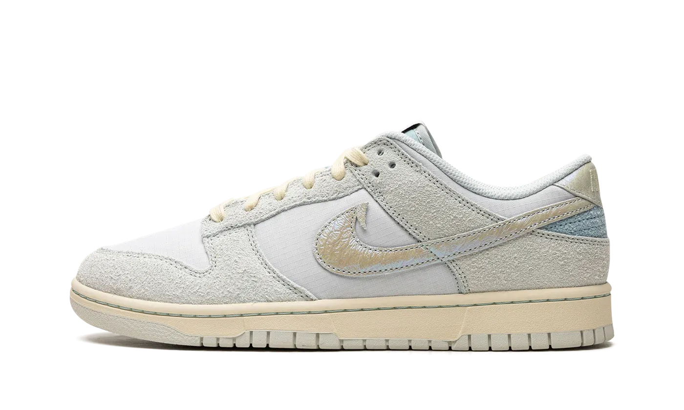 The Nike Dunk Low "Gone Fishing" is a colorway of the retro basketball and casual shoe with a fish-inspired appearance. Also known as the "Chinook Salmon" colorway, this Dunk Low features an eye-catching design with iridescent scaled Swooshes, including a "tooth" appearing at the top of the Swoosh on the lateral side. As for the rest of the shoe, the base is made from a Photon Dust ballistic nylon base. Tonal suede overlays add another visual appeal to the sneaker. Fish detailing is printed on the tongue tag and insole. The cream rubber midsole and matching laces give the design a vintage look. Release date: June 16, 2023