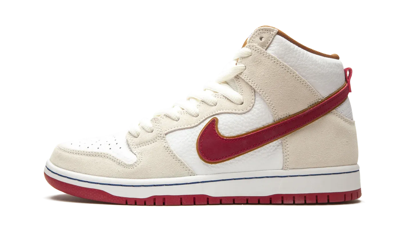 The Nike SB Dunk High "Phillies Blunts" is a smoking hot colorway of the venerable high-top skate shoe that was released in Summer 2020. Similar to the "Cigar City" Dunk of 2011, the "Phillies Blunts" colorway unofficially features the color scheme of the Philadelphia, PA cigar company's classic logo and product packaging. The upper features white tumbled leather on the mid-panel and perforated toe. Beige suede overlays appear on the forefoot, eyelets, collar, and heel. Team Crimson Swoosh detailing covers either side, and light blue "Nike Air" branding covers the white nylon tongue tab. Being the skate-oriented version of the Dunk, the collar packs extra padding for support. Additionally, Zoom Air cushioning is embedded in the forefoot and heel of the midsole to ensure top-level comfort. The Nike SB Dunk High "Phillies Blunts" was released on July 4, 2020.