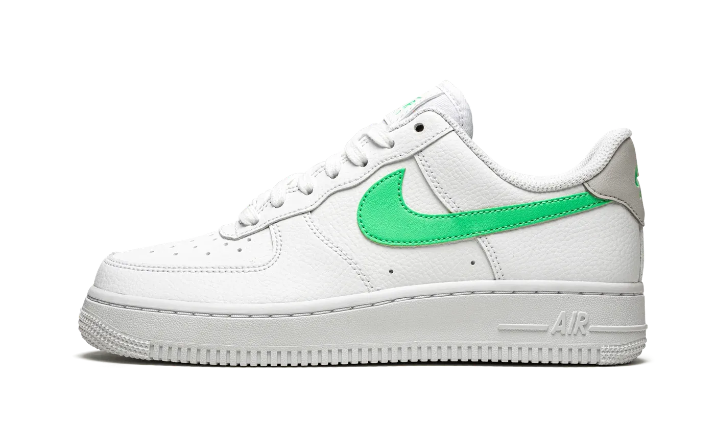 The Women's Nike Air Force 1 Low "White/Green Glow" presents the classic basketball sneaker with a pastel pop. This AF1 Low for women is constructed with a white leather upper, accented with a vibrant Green Glow shade of green for the Swooshes and tongue and heel branding. A light grey heel tab adds one more color component to this clean, summer-ready Air Force 1.